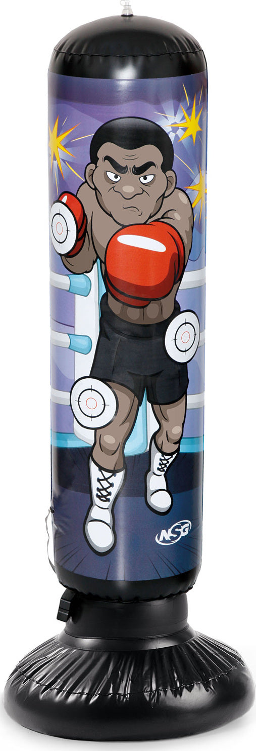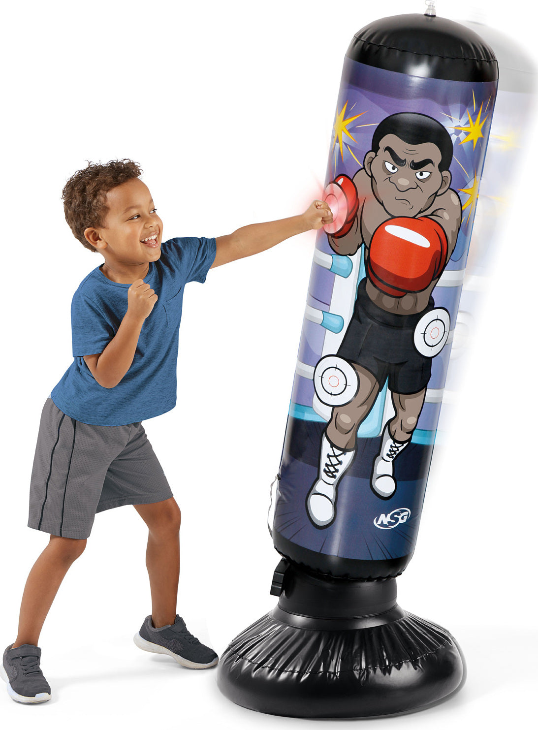 • NSG Junior Electronic Kickboxing Light Up Punch Bag. Get ready to rumble with a new sparring partner! This Kickboxing bag for kids features light up LED targets that let you know where to hit, and sounds off with hilarious sound effects and fight cries when you hit the target. This boxing buddy can sure take a hit! The weighted base can be filled with sand or water so when you knock him down, he pops right back up. Fully inflated measurements: 10” L x 10” W x 45”.