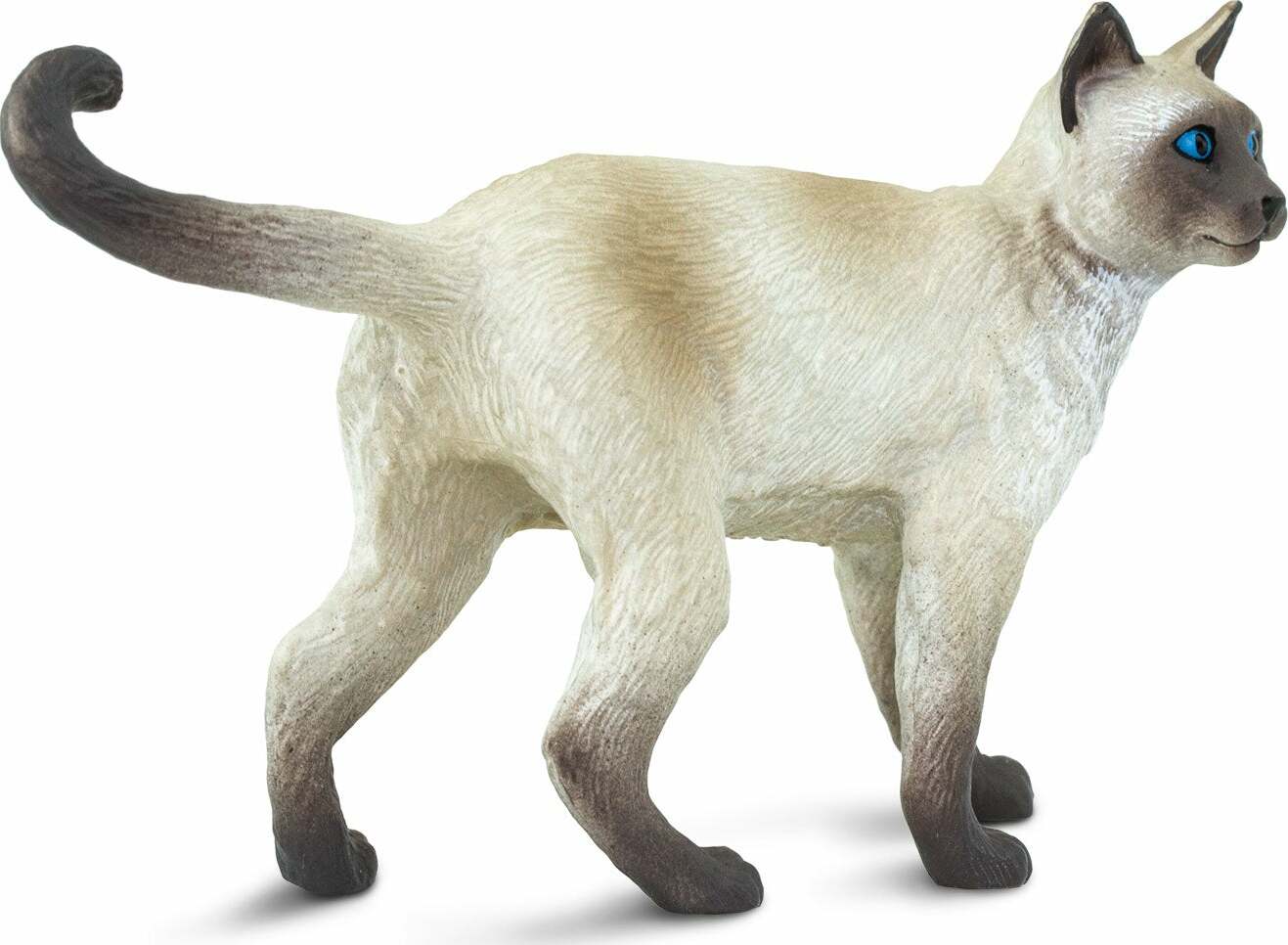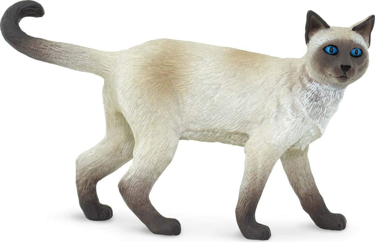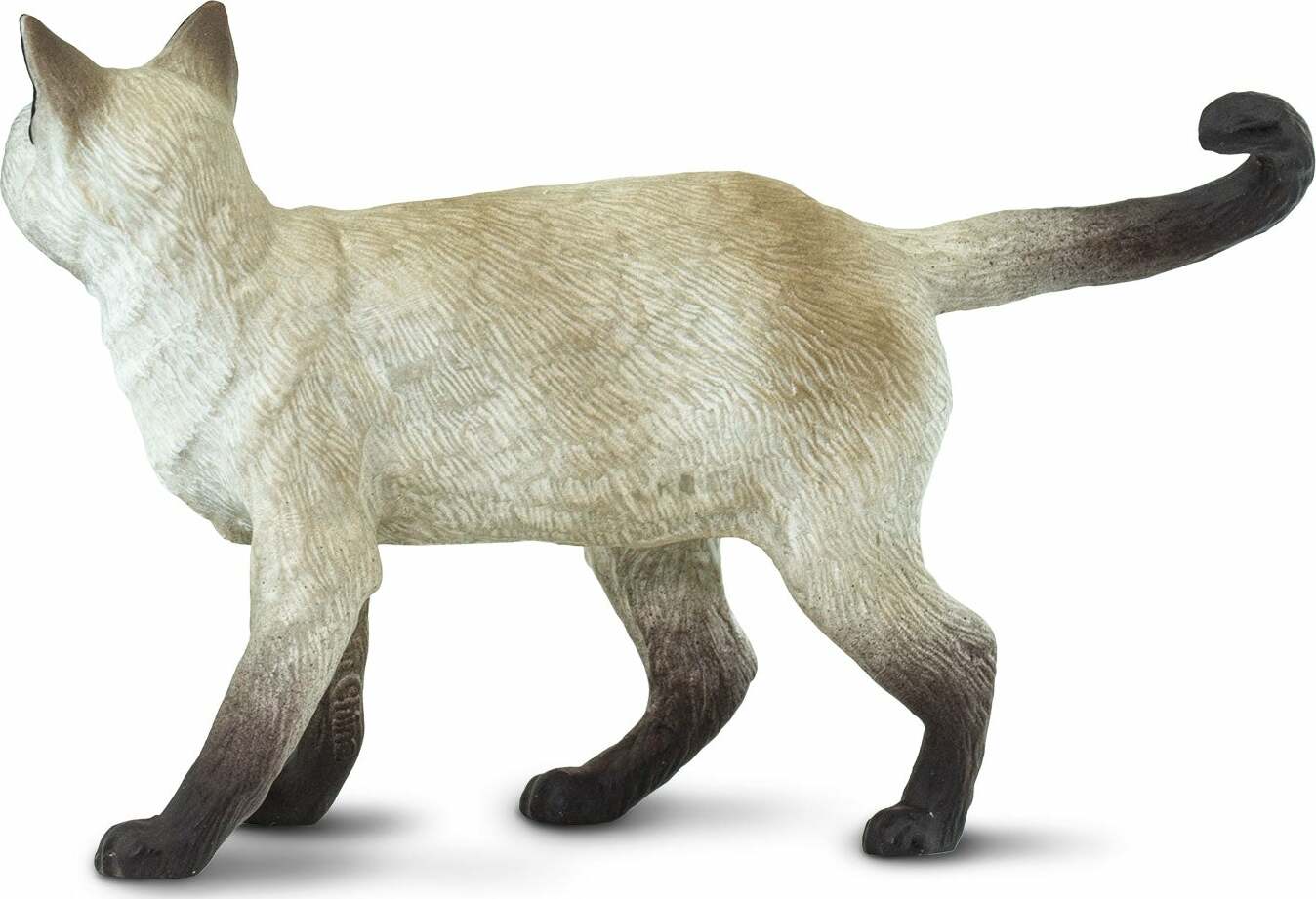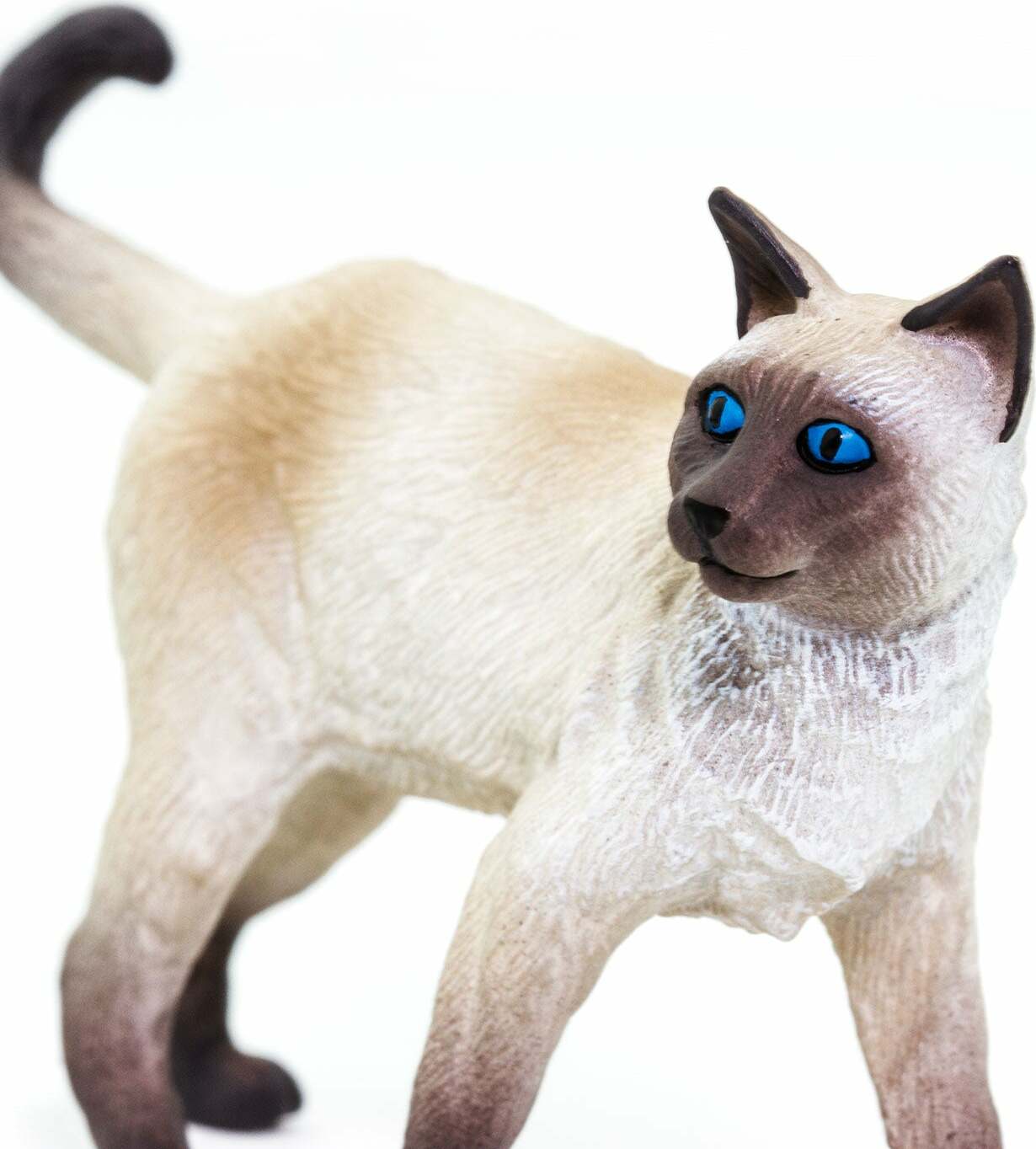 - Size and Color: This cat figure is 3 ¼ inches long and 2 inches high, making it almost exactly the size of a credit card stood on its side. It features the typical Siamese pointed pattern, with a pale cream body and dark brown at the feet, face, ears and tail tip. It also has striking blue eyes, another trademark Siamese feature.