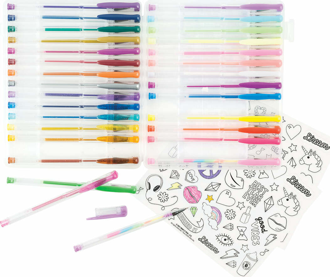 This boxed set includes 30 gel pens plus over 100 color-in stickers