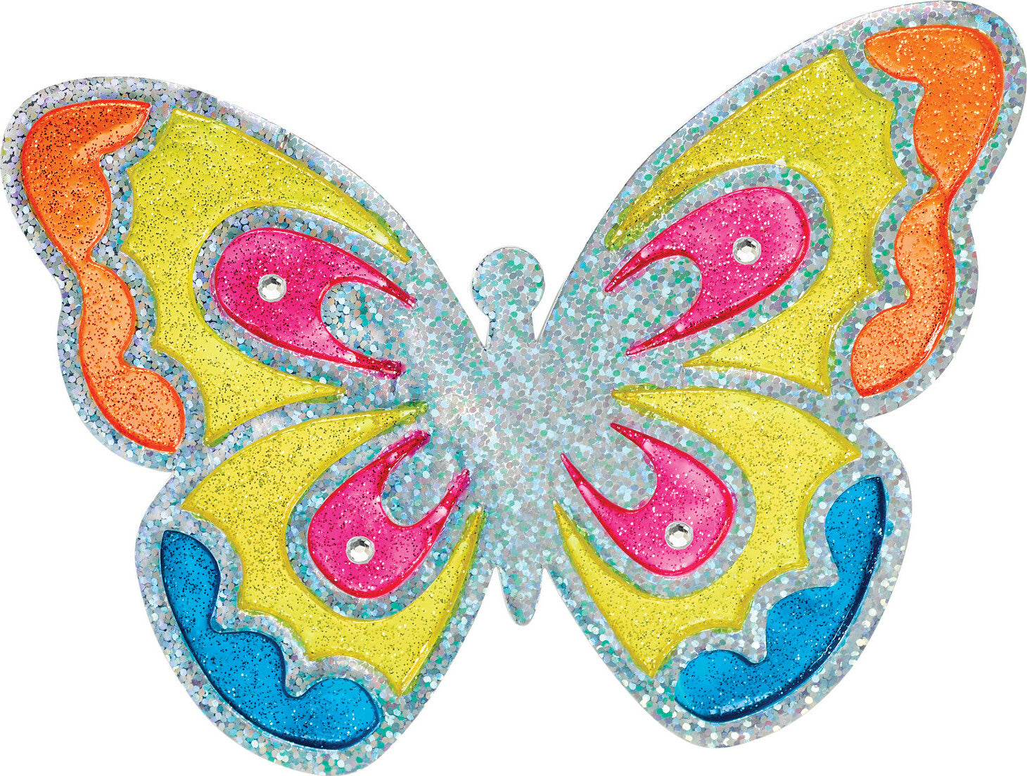 Dimensional foil Butterfly and Rainbow come ready to decorate. Just fill in the designs with an array of sparkle window paint and rhinestones.