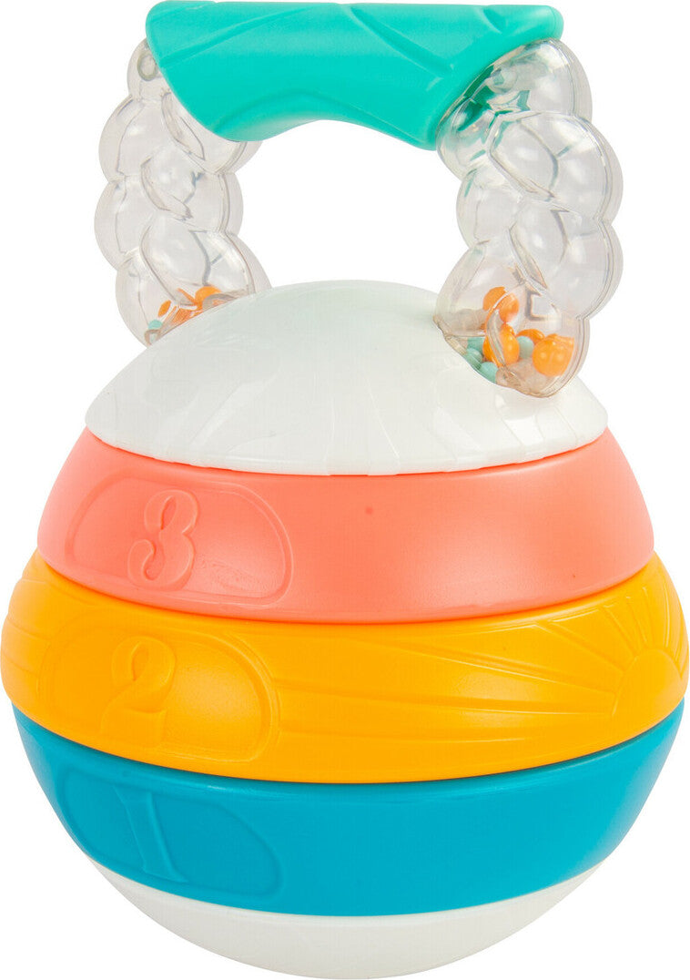 - Classic Stacking Toy with a Twist! Twist top onto the base to keep the pieces together and let baby join the work out fun with a kettlebell featuring fun rattling sounds