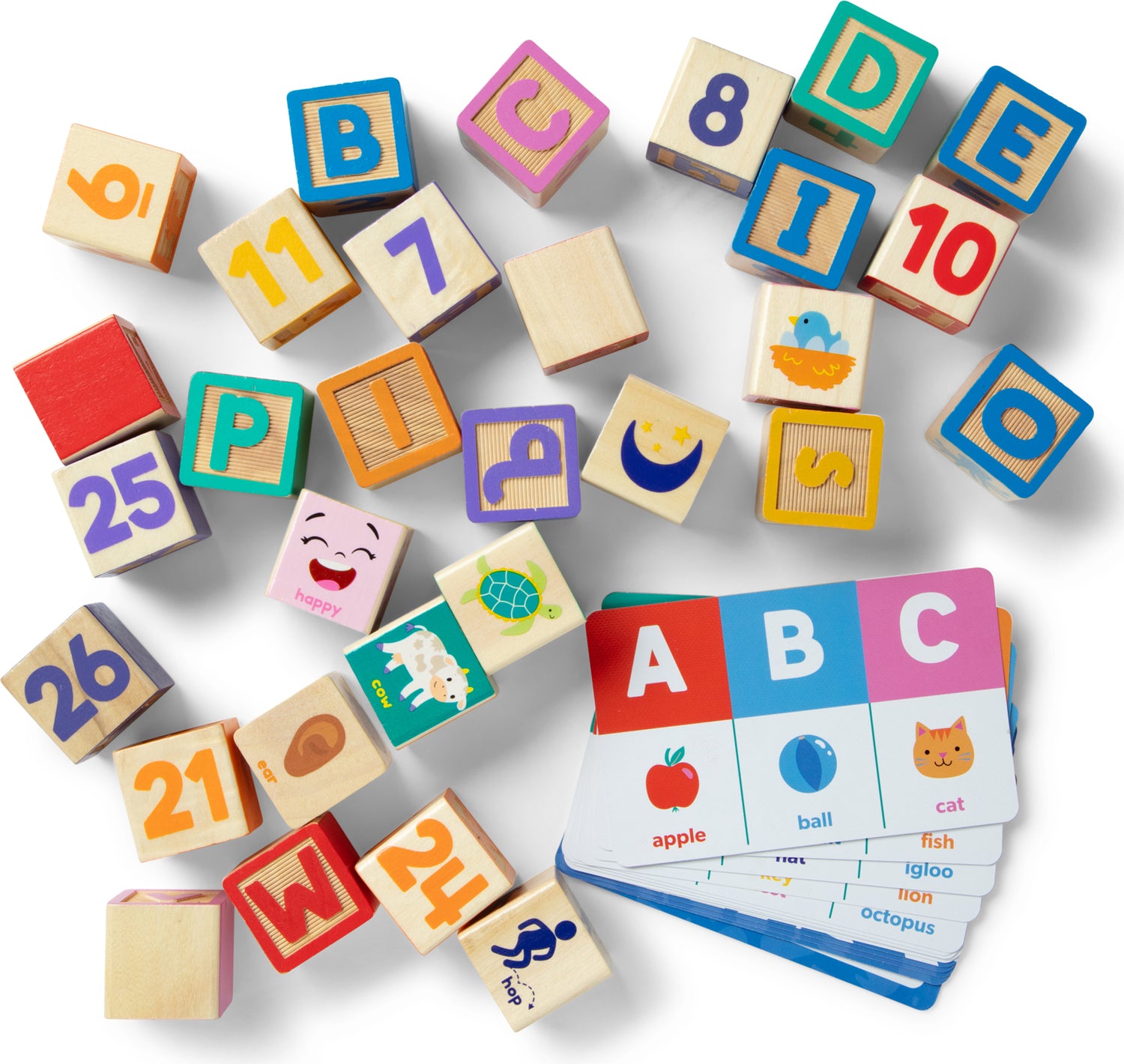 Regular price $34.99Stack, roll, match, and learn with Melissa & Doug® Ms. Rachel™ Wooden Learning Blocks! Inspired by Ms. Rachel’s popular baby and toddler videos, this blocks and activity cards set is made with love to support learning for littles, and is packed in a sturdy box, for on-the-go play and easy cleanup. Stimulate cognitive development with 26 blocks (1.5 inches each) that help kids identify letters, numbers, pictures, and colors. Encourage language skills, turn-taking, and social skills with four game blocks, featuring animals, body parts, emotions, and movements, along with 14 double-sided activity cards for matching, counting, play ideas, developmental skill information and tips. Block play is great for boosting fine motor skills and self-esteem, as little hands grasp, build, and play.