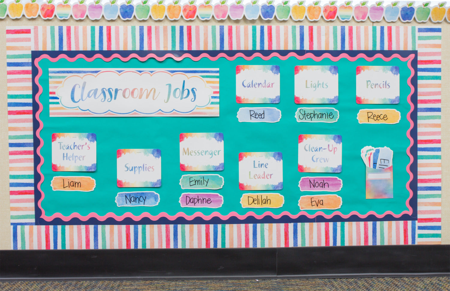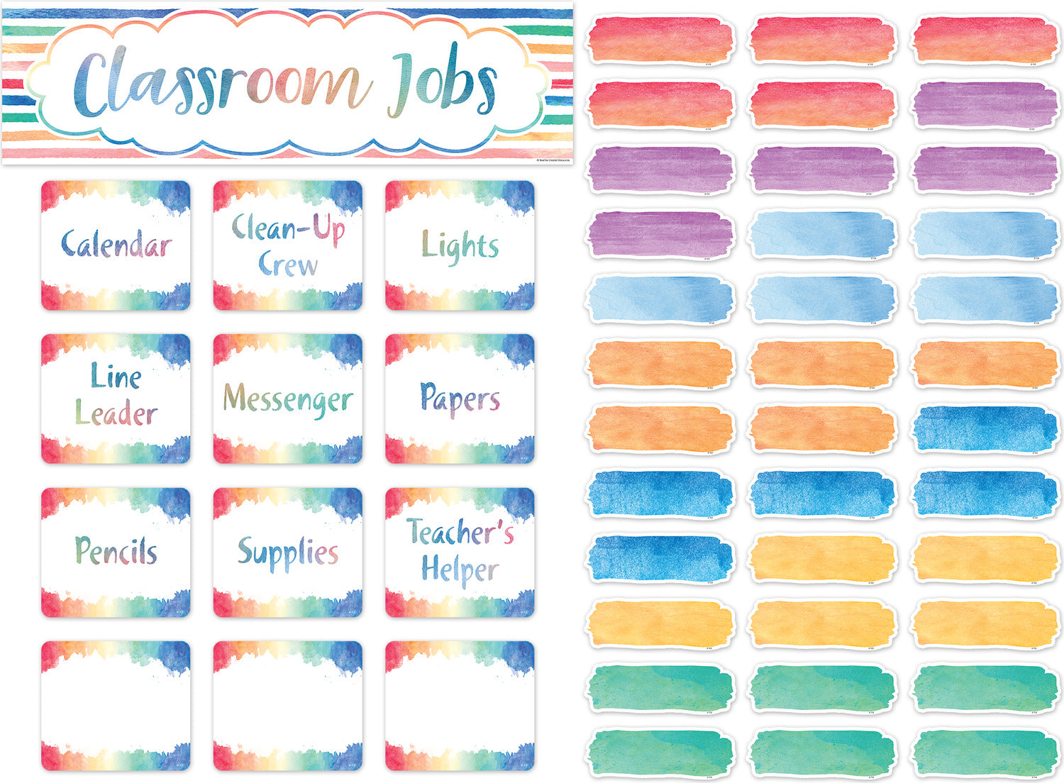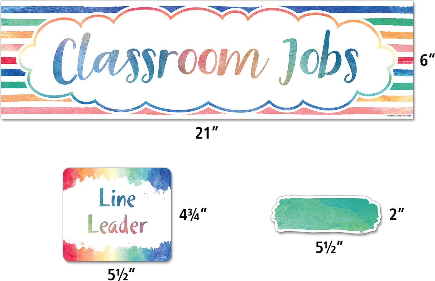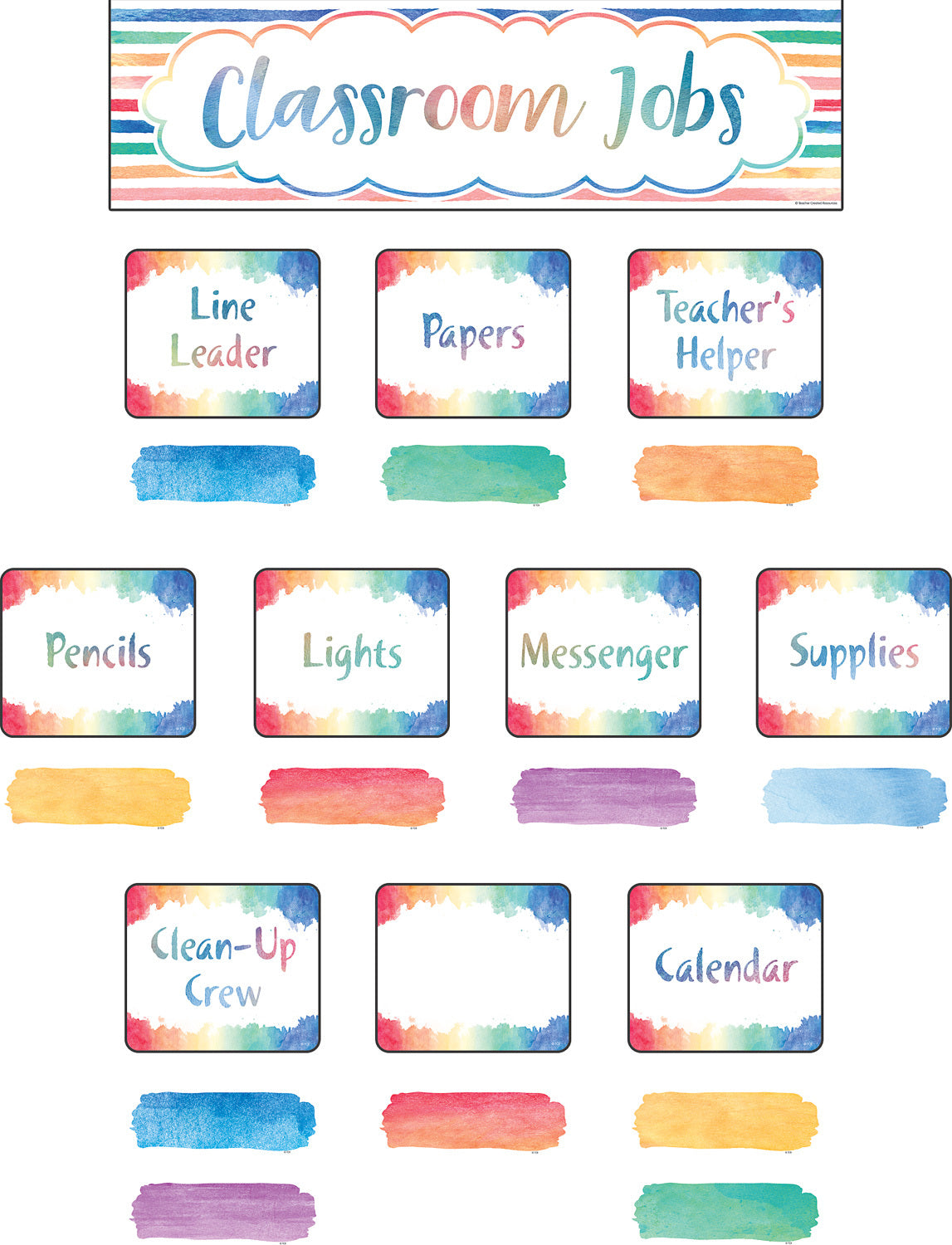 Set a soothing tone in your class with this beautiful classroom jobs display. The header piece measures 21" x 6". The set includes titles for Calendar, Clean-Up Crew, Lights, Line Leader, Messenger, Papers, Pencils, and Supplies, plus blank pieces that you can customize. 49 total pieces.