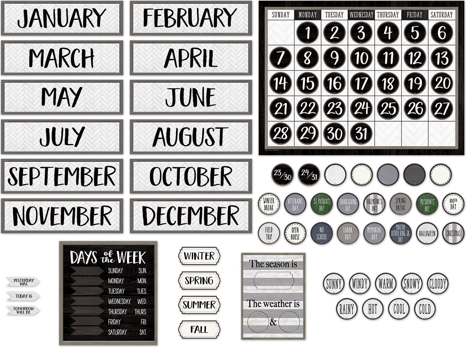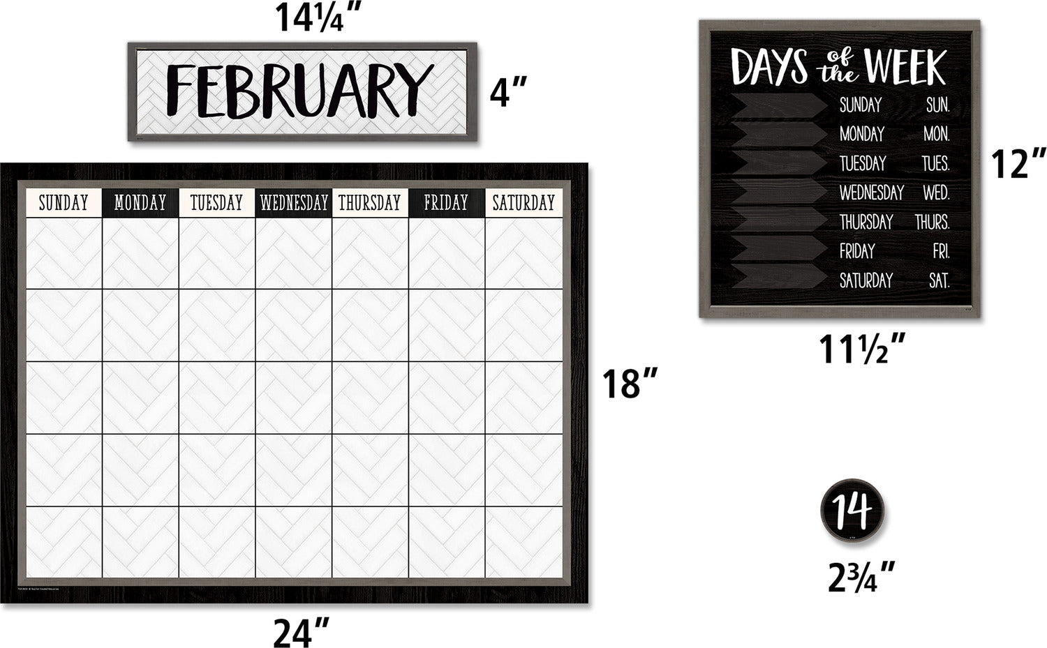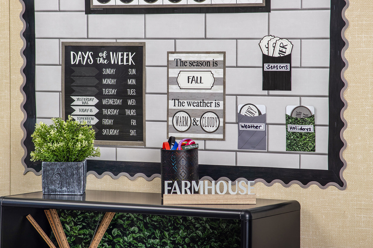 Regular price $17.99Modern Farmhouse Calendar Bulletin Board, by Teacher Created ResourcesThis chic calendar display comes with easy-to-read number pieces, colorful monthly headers, and additional pieces for holidays and special occasions as well as yesterday, today, and tomorrow...