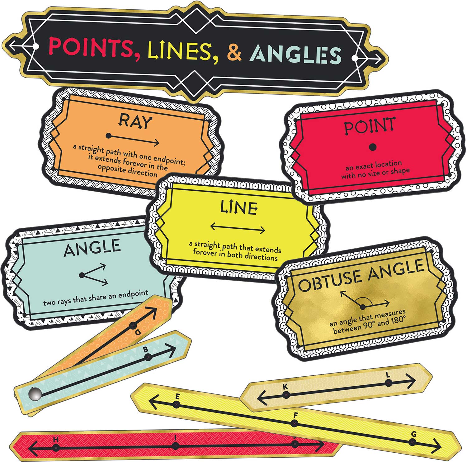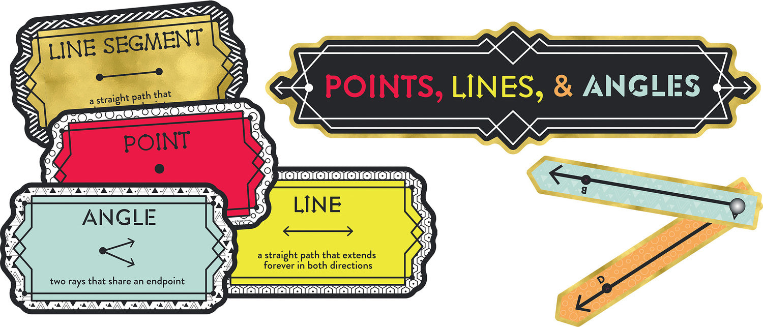 Enhance geometry instruction with the 18-piece Points, Lines, and Angles mini bulletin board set. Each term is named, defined, and illustrated on individual mini charts. Make geometry come to life by using the five line and ray pieces to create interactive angles and intersecting lines.