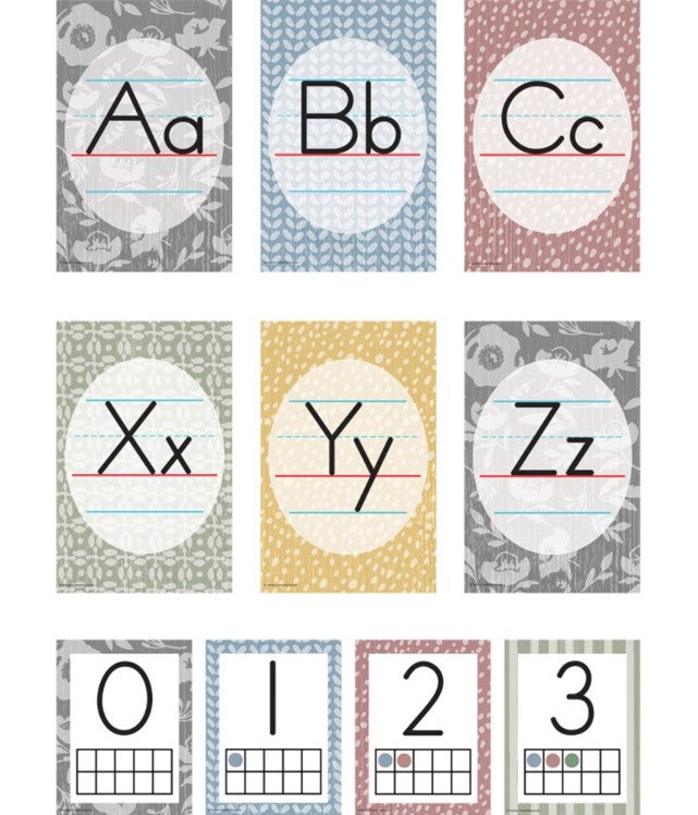 Regular price $16.99The comforting, welcoming hues of this bulletin board will make learning the alphabet and numbers inviting! Alphabet cards feature upper and lower case letters–each measure 5-1/2" x 8-1/2". Number cards range from 0-10 and use dots to depict the number amount–each measure 4-1/4" x 5-1/2". 37 total pieces.