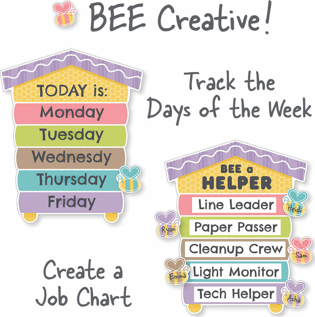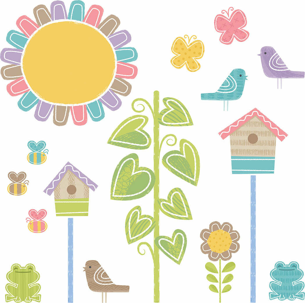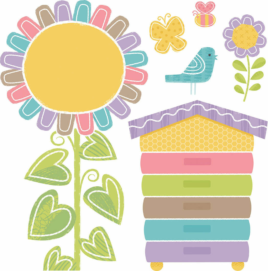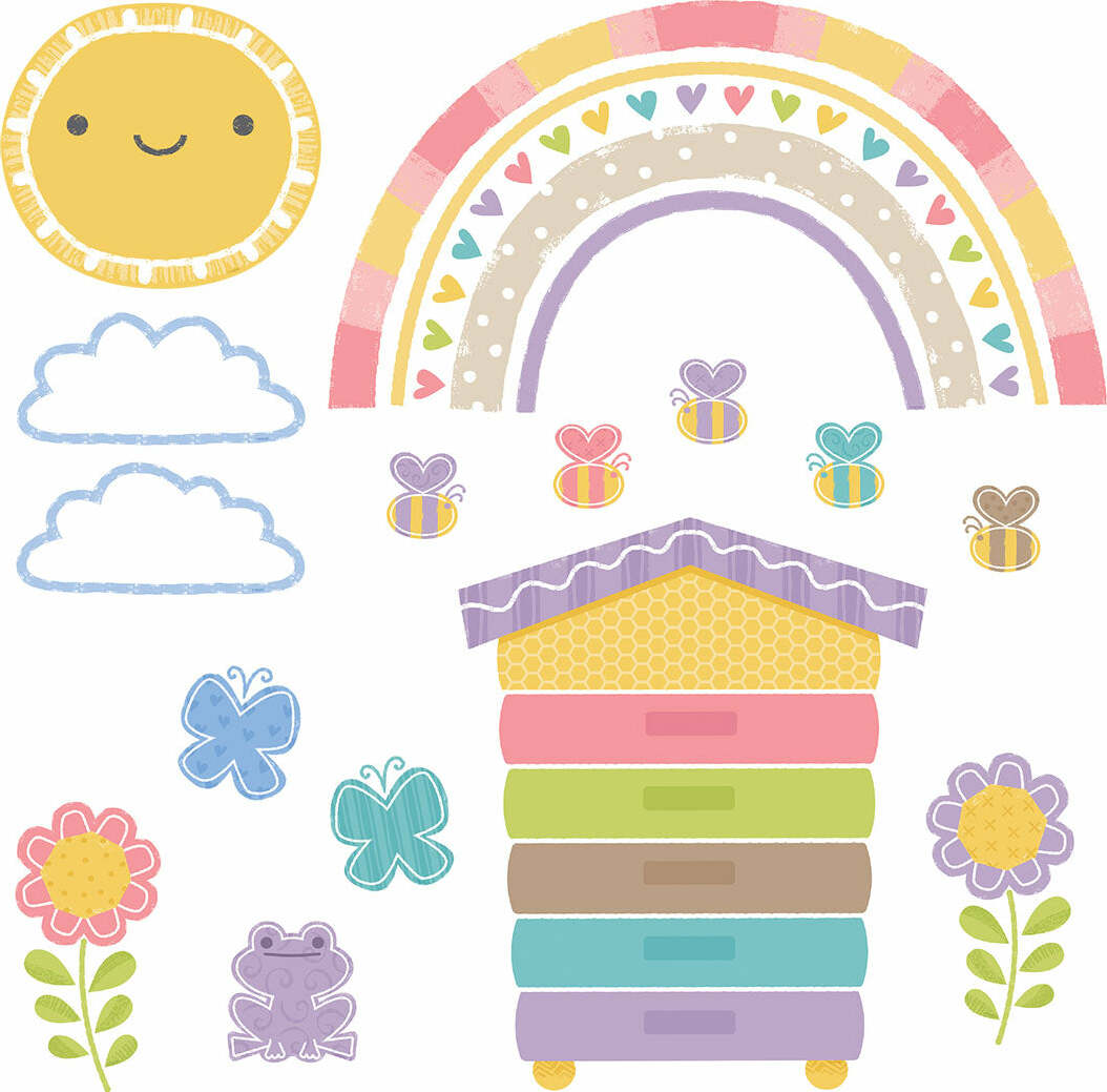 Create a place where kids can grow! Inspire learning through playful touches of nature with the Rainbow Garden Bulletin Board Set. Large, versatile decorations and coordinating accents can be customized to suit any space or learning objective. Great for announcements, reminders, job charts, goal tracking, calm corners, and more. Pair with other materials from the Good to Grow Collection to create an immersive learning environment. Includes rainbow (26" wide), beehive (19" tall), sunflower (2 adjustable pieces), sun, 2 clouds, 2 birdhouses with poles, 3 flowers, 8 bees, 4 butterflies, 3 birds, and 3 frogs.