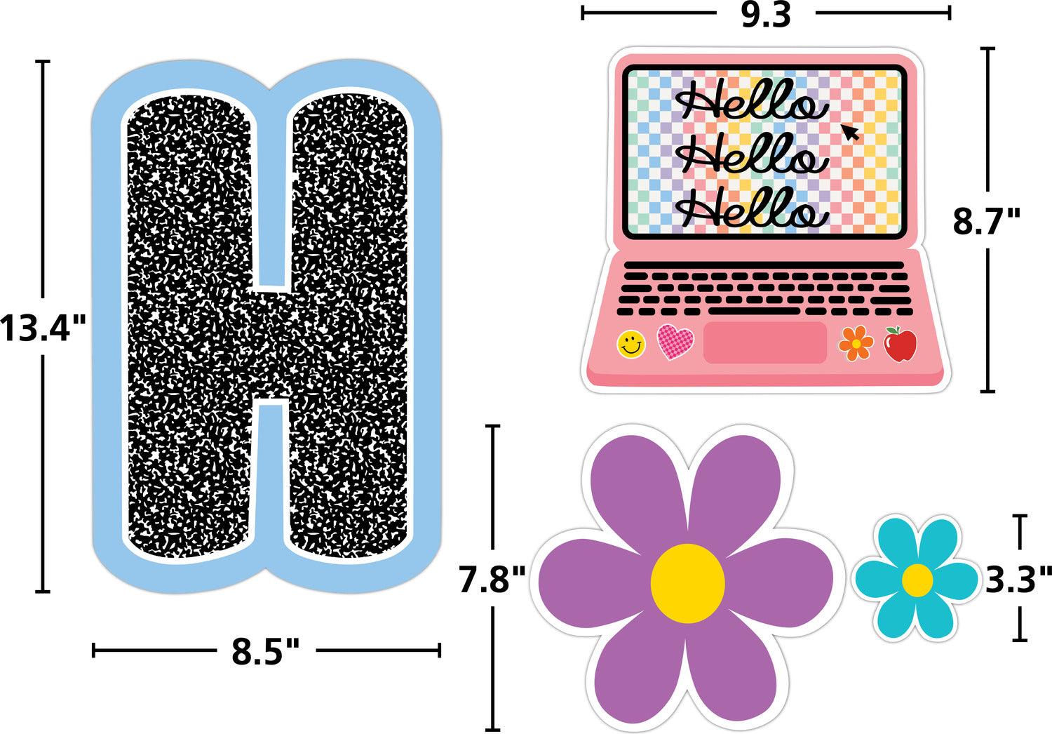 • Features: 8 pieces spelling out “Happy you are here!”, 14 pennants, 10 large decorative accents and 16 small decorative accents. 40 total pieces. The tallest letter is about 13-1/2".