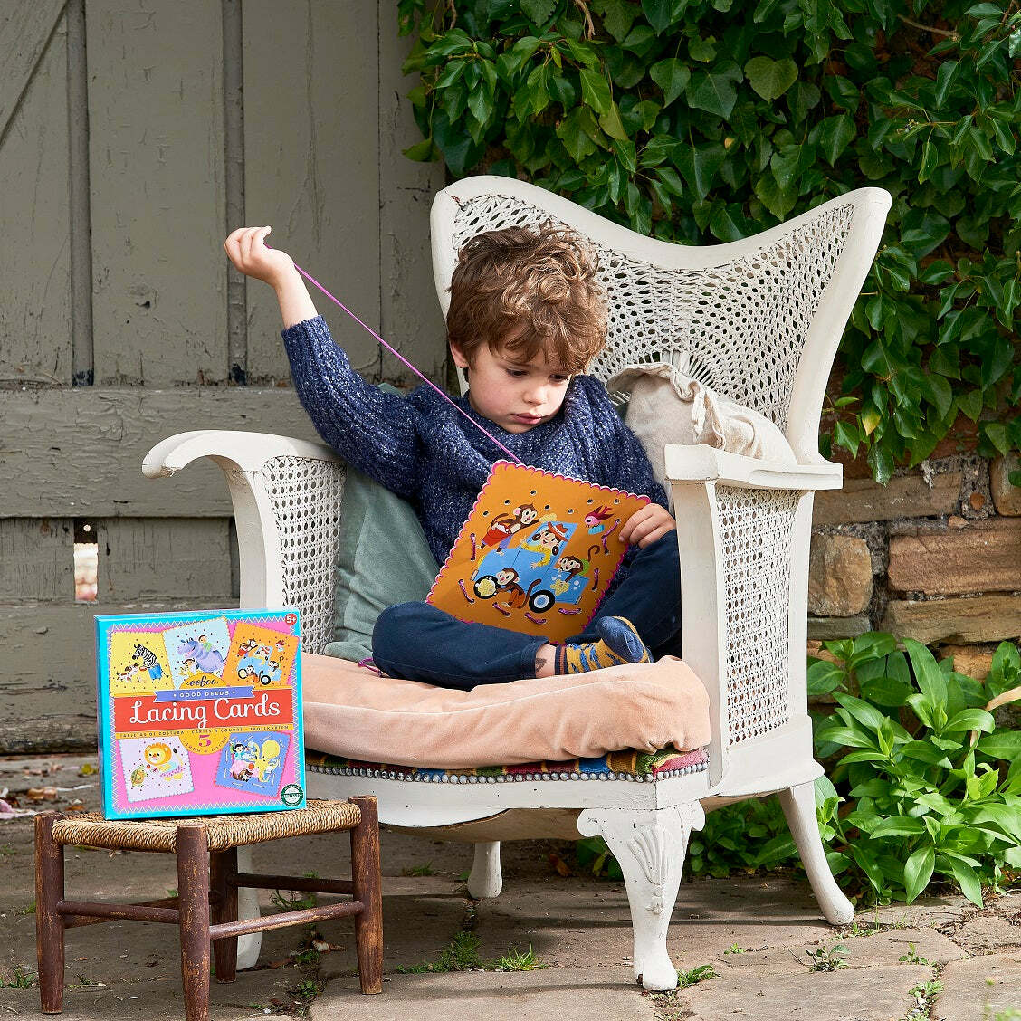 - Includes 5 large, shaped lacing cards and five 48" color laces (Lime, Blue, Red, Purple, Orange)