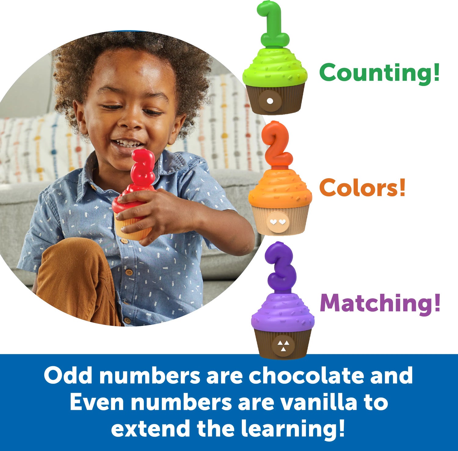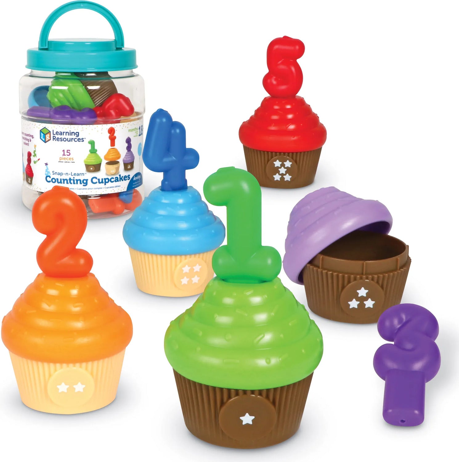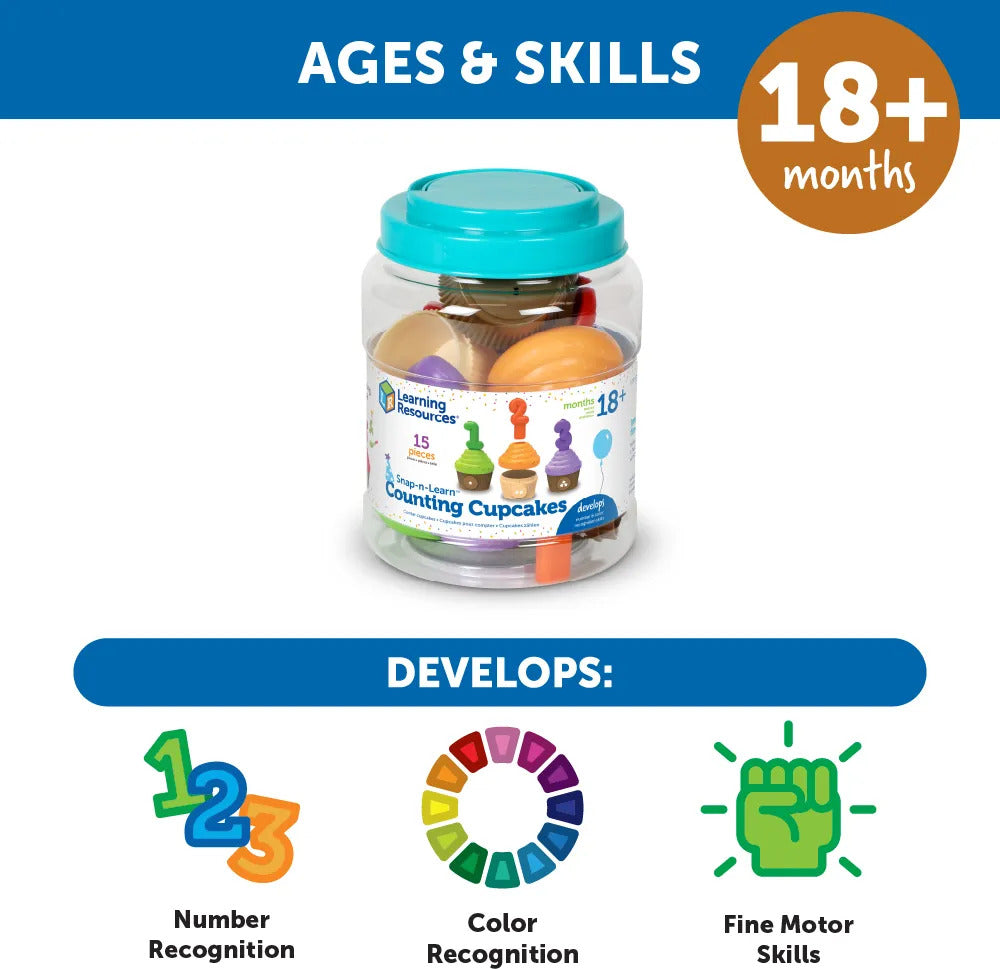 Regular price $29.99Turn learning to count into a colorful cupcake party! Toddlers build new counting, color, and number skills every time they snap with this set of Snap-n-Learn Counting Cupcakes from Learning Resources. A festive party-ready entry in our popular Snap-n-Learn line of toddler learning toys, these fun two-piece cupcakes come with a cool snap-apart, push-together action that helps little hands build essential coordination and other fine motor skills. You can even make up your own fine motor game or preschool learning activities! The skill-building fun doesn't end there, though—this educational toddler toy come with 5 pop-in number candles, so kids can learn new counting and number recognition skills with every playtime! This set of Snap-n-Learn Counting Cupcakes comes in a reusable plastic storage bucket—when playtime is over, these toddler toys store quickly and easily until next time. Ready for all kinds of preschool learning activities, this set makes a natural addition to toddler Montessori toys in homes or classrooms. When your kids play with preschool learning toys from Learning Resources, they’re doing more than just having fun. They’re also learning essential skills. Our award-winning educational toys keep kids engaged through hands-on, screen-free play that helps them build and retain new talents in letters, numbers, shapes, colors, and more. Made from durable, BPA-free plastic, our preschool toys are ready for years of learning fun at home or in the classroom. We're Learning Resources, and learning is where we play. With nearly 40 years of experience, our family-owned company’s mission is founded on offering kids educational toys for infinite inspiration to succeed in school and beyond. From ABCs and 123s to fine motor and STEM, our award-winning educational toys help kids discover countless ways to develop a lifelong love of learning while they build new skills. In 2022, Learning Resources expanded this dedication to learning and enrichment with Brightkins, a line of interactive pet training tools and toys that help families discover bright ways for pets to play! Learn more about how we turn a childhood love of play into a lifelong love of learning with a visit to our brand store today.