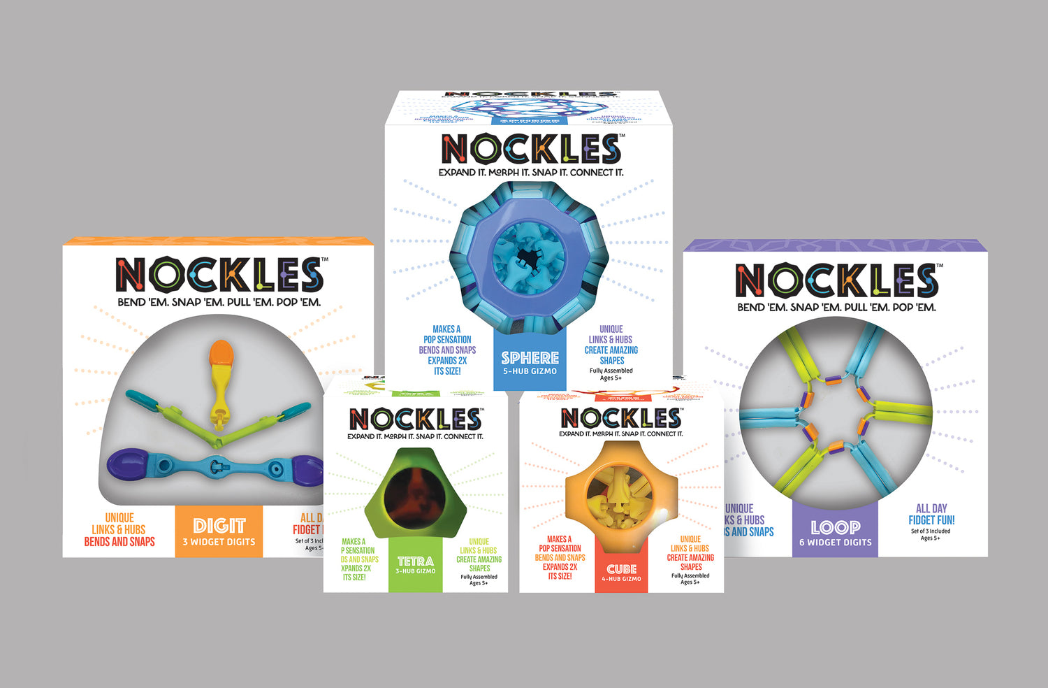 Nockles are a fantastically fun collection of soft, bendable & connectable fidget toys that snap together and morph into amazing shapes. You can expand ‘em, collapse ‘em, snap ‘em, pull ‘em, flip ‘em, bend ‘em, and pop ‘em. It’s fun to crack your Nockles!