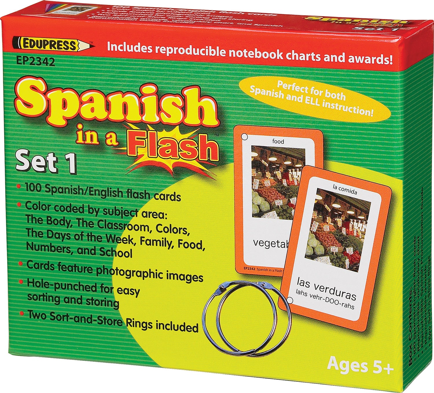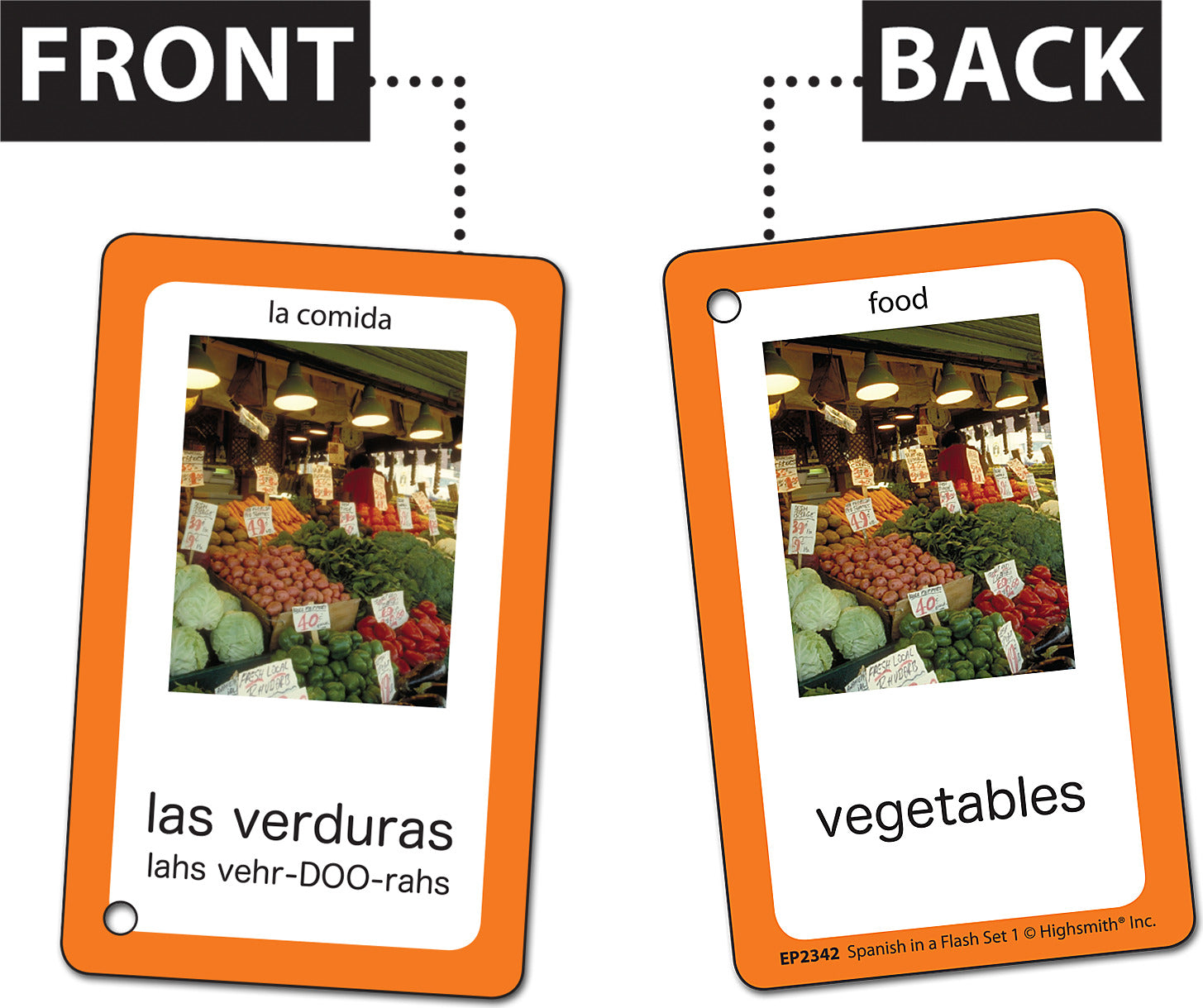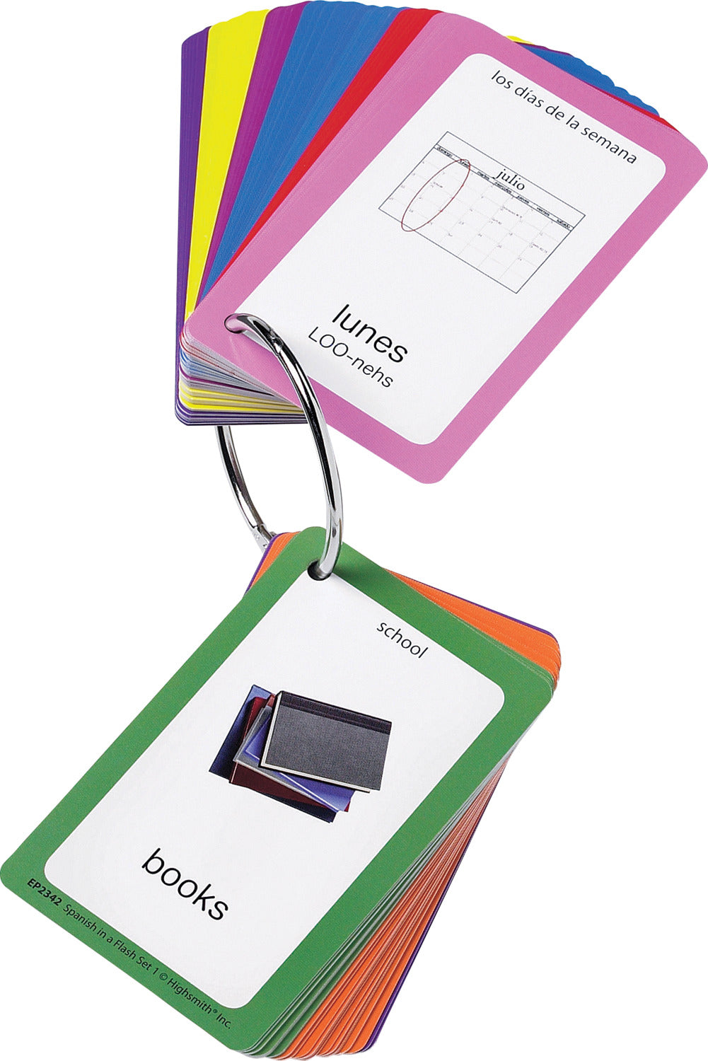 Spanish in a Flash makes it easy for students to work at their own pace as they master sets of words. Color-coded cards feature full-color photos. Phonetic spellings aid in pronunciation of Spanish words. Pre-drilled holes for storage on included sort-and-store rings. Includes reproducible vocabulary chart and Spanish pronunciation guide. Set of 100, 2-1/2" x 4" cards. Supports requirements of Title I and other federally-funded programs.