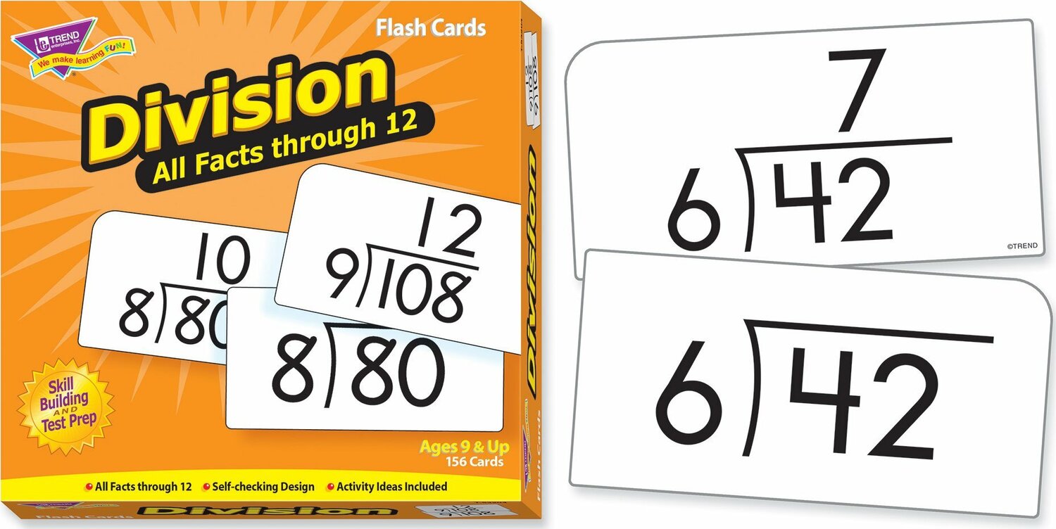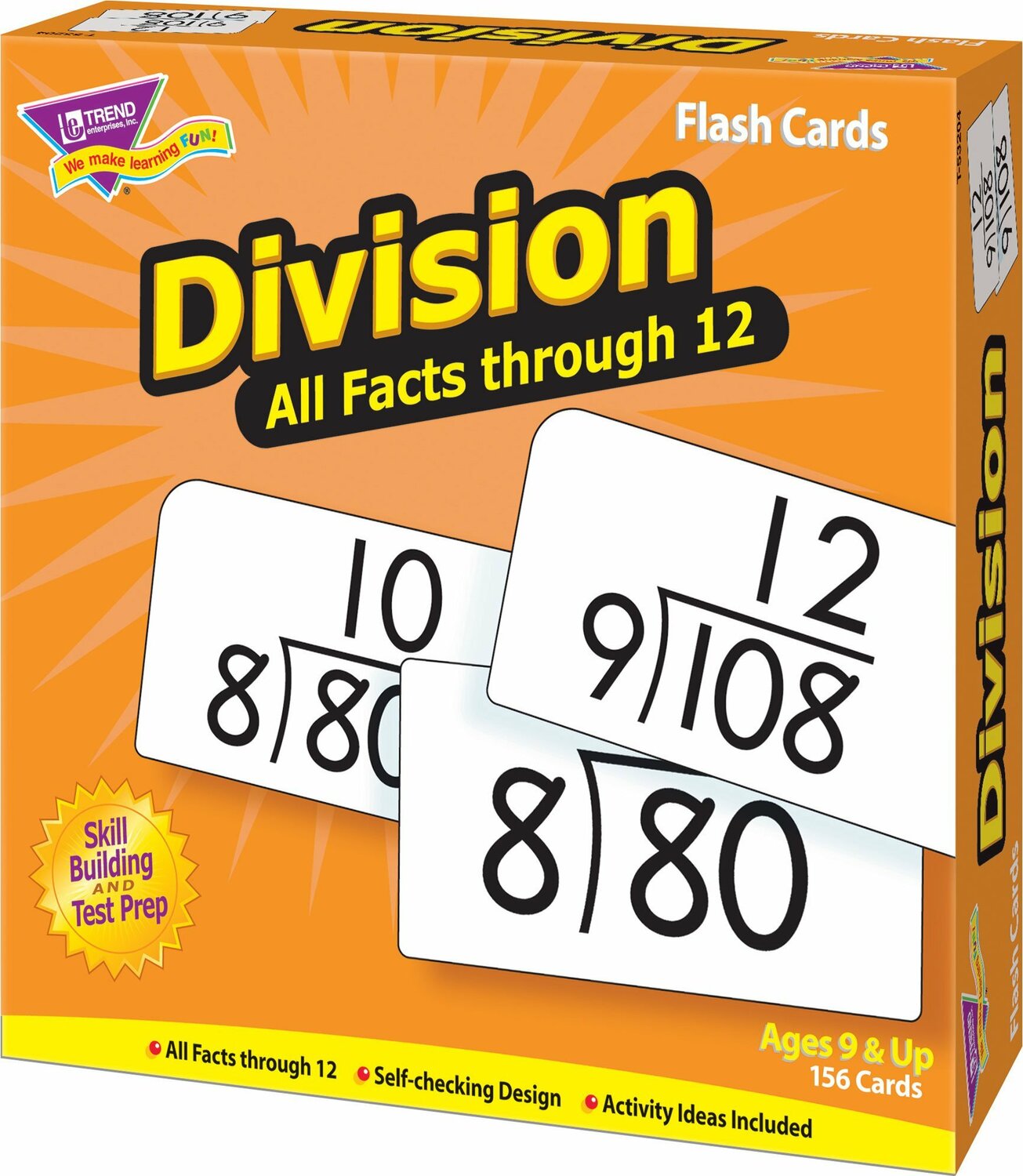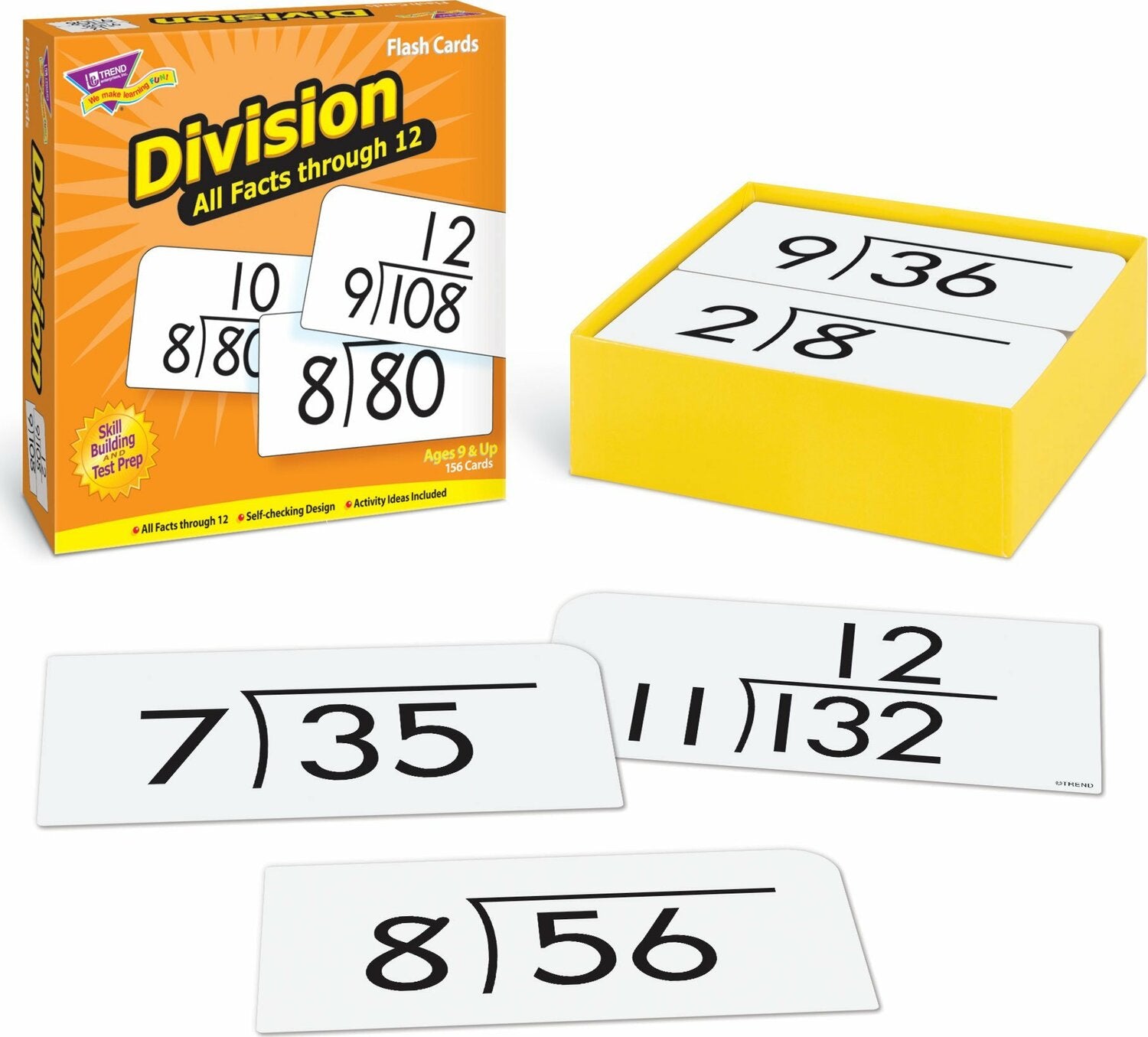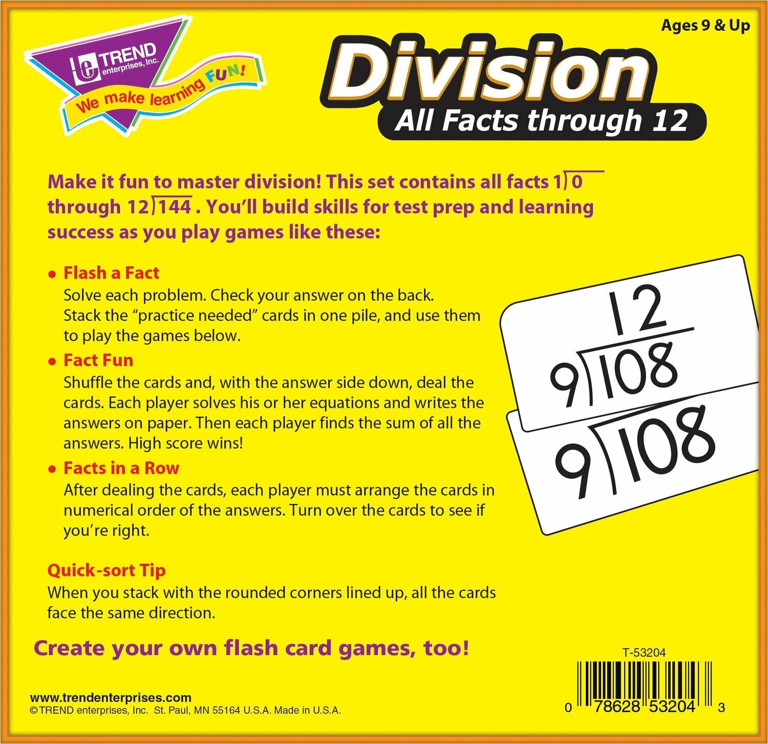 Big sets … big results! Present, practice, and assess one- and two-number division skills with this set of cards that cover equations from 144/12 to 1/0 that give every whole-number quotient from 12 to 0. Self-checking, with answers on the back of each card. Sturdy cards and storage box. Extra ways to play described on the box back!