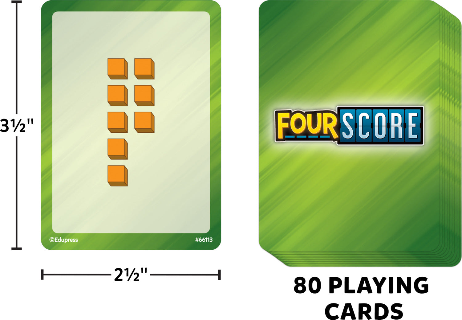 Regular price $11.99Four Score is a fun and fast-paced matching game that challenges young learners to recognize the similarities in four different representations of a number. Players are dealt 4 cards and try to pass off cards they don't need while collecting all 4 parts of a number's set. The 4 parts are the number in numerical form, in word form, in tally marks, and in base 10 blocks. The first player to collect all 4 parts wins the hand and 1 point. The first player to earn 4 points is the Four Score winner. Includes an instruction sheet and 80 playing cards.