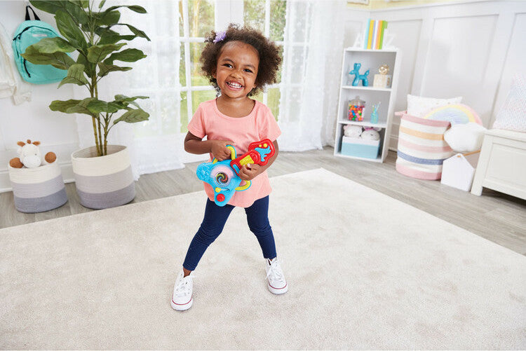 Strum the guitar to explore sounds and songs! Features 2 modes includes instrumental notes and musical songs including Twinkle Twinkle Little Star and You Are My Sunshine.