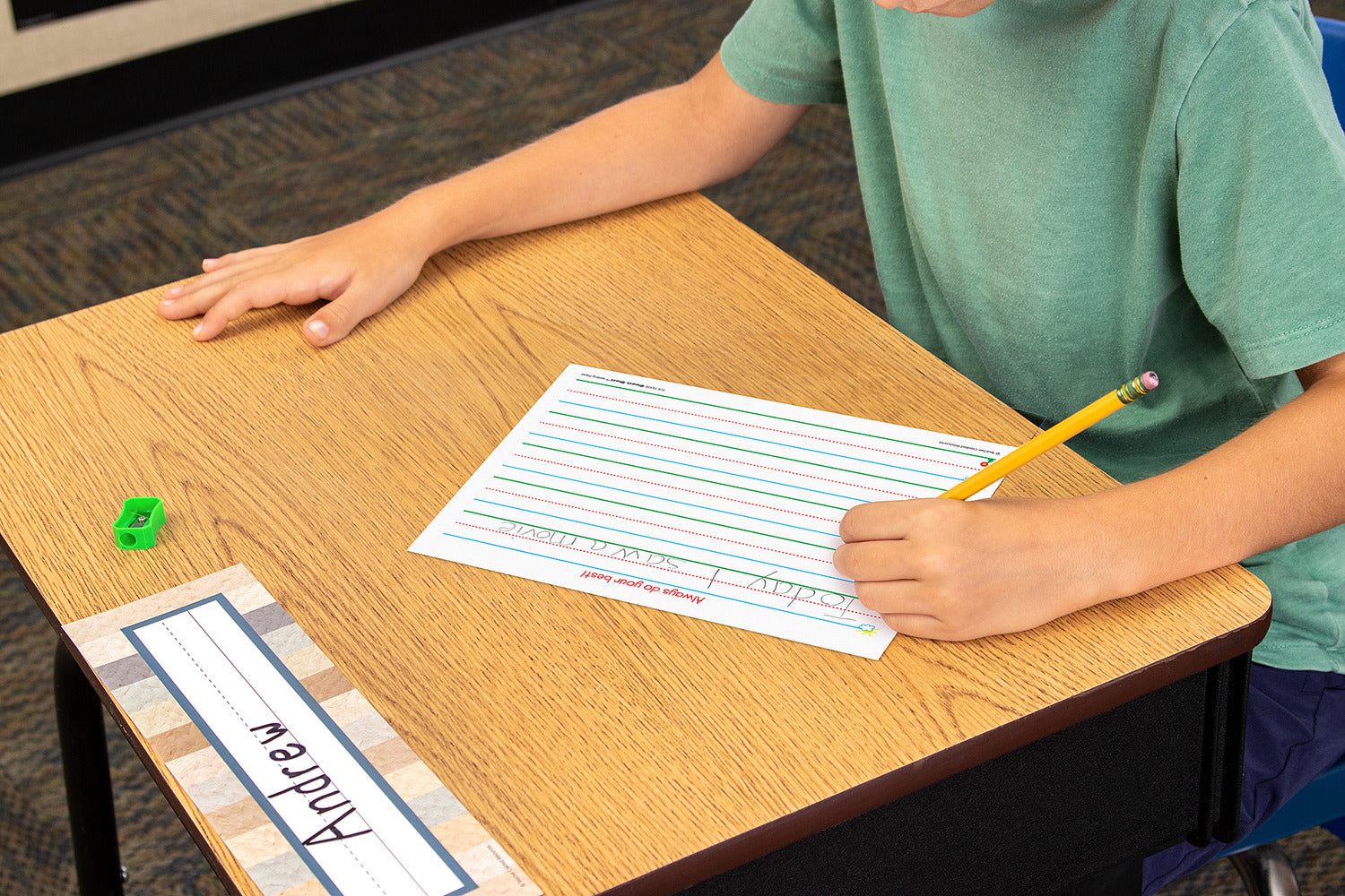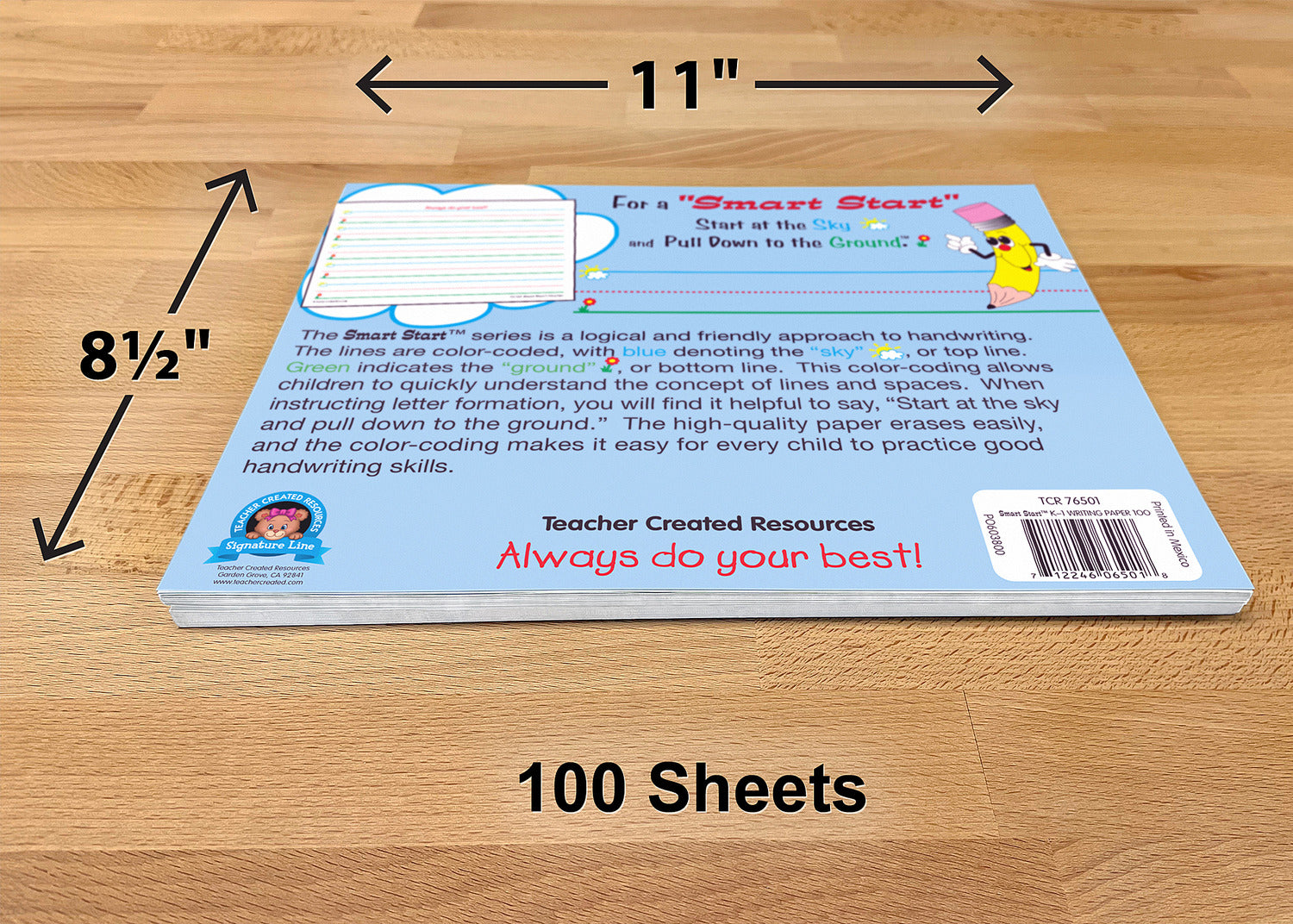 Regular price $16.99Smart Start Writing Paper (8-1/2" x 11") is truly a "Smart Start" for beginning and experienced writers. Bold graphics in blue, green, and red promote the feeling of success as children simply "Start at the sky and pull down to the Ground" to form letters correctly. K-1 Writing Paper lines have 1" spacing. Package includes 100 sheets.