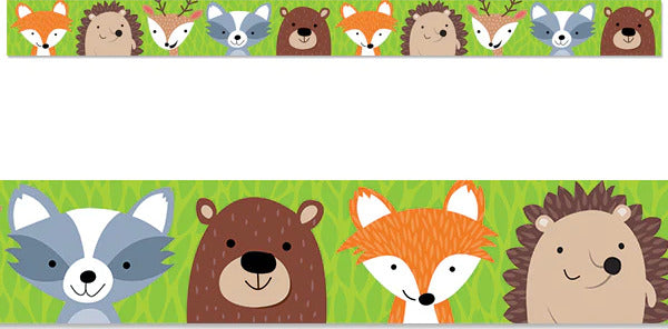 This cute Woodland Friends border will add charm to bulletin boards, doors, and common areas. This border features colorful woodland animals (fox, deer, hedgehog, bear and raccoon) on a leafy green background. Perfect for use in a variety of classroom displays and themes: science, nature, outdoors, animals, and camping.
