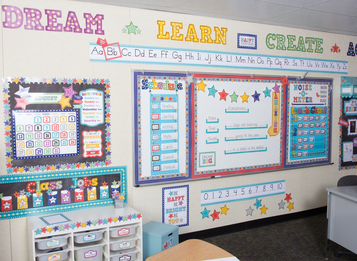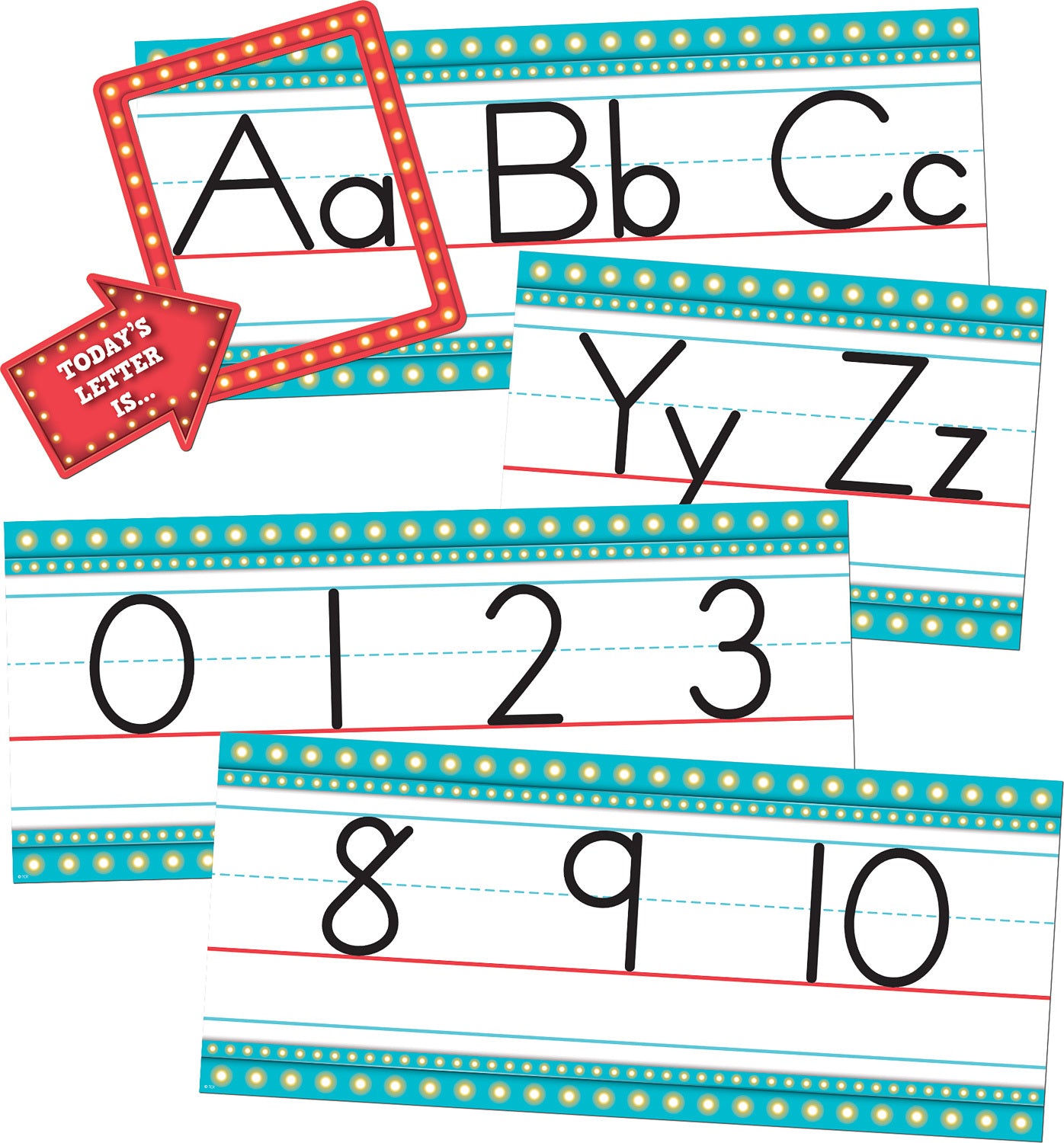 Regular price $17.99Decorate as you educate with this easy-to-read alphabet line. Includes a frame and arrow that can be used to highlight a letter of the day. Includes numbers 0-10. Also includes a teacher''s guide with suggested activities. Each 3-letter panel is 17-1/2" x 5-1/2". 14 total pieces.