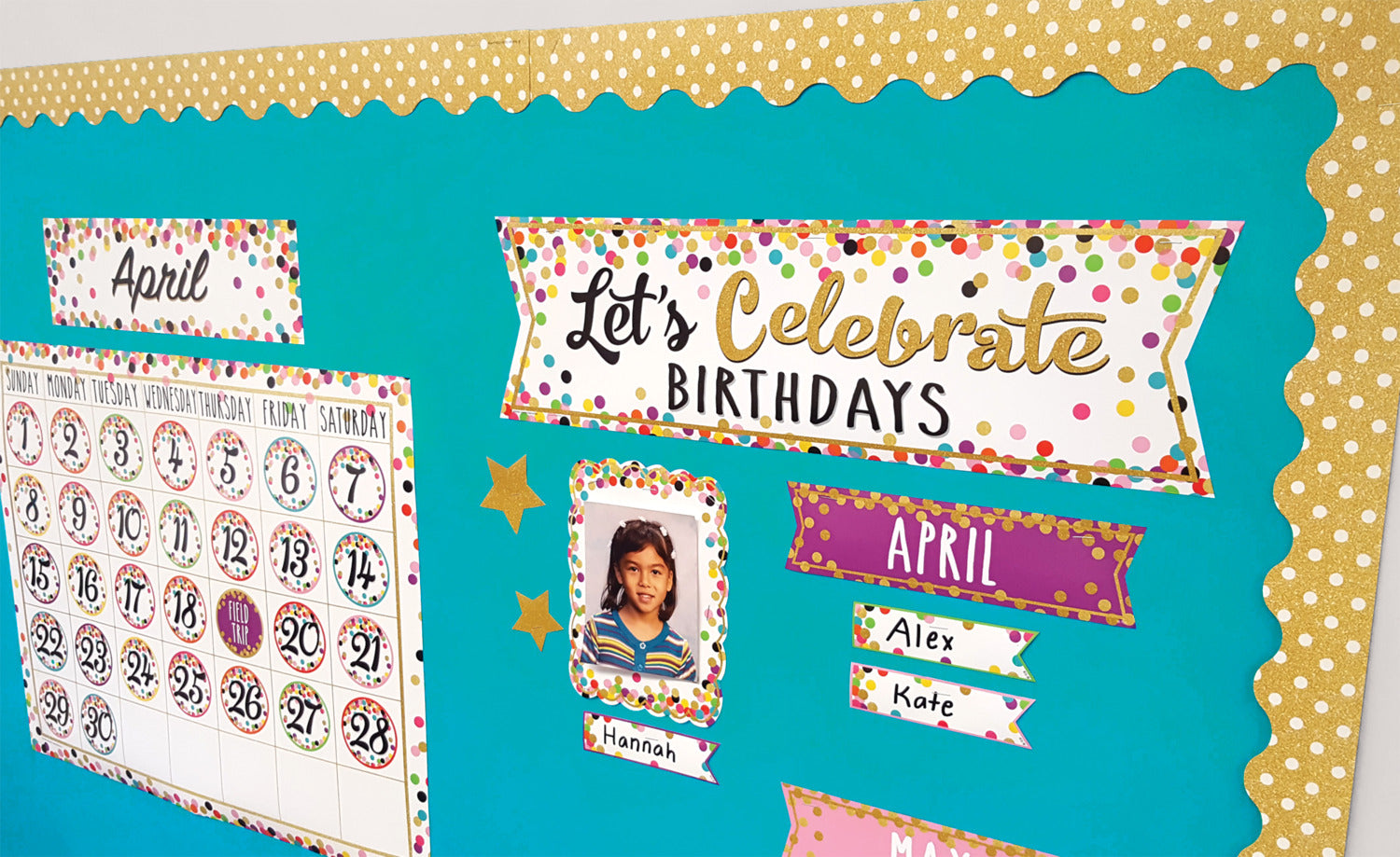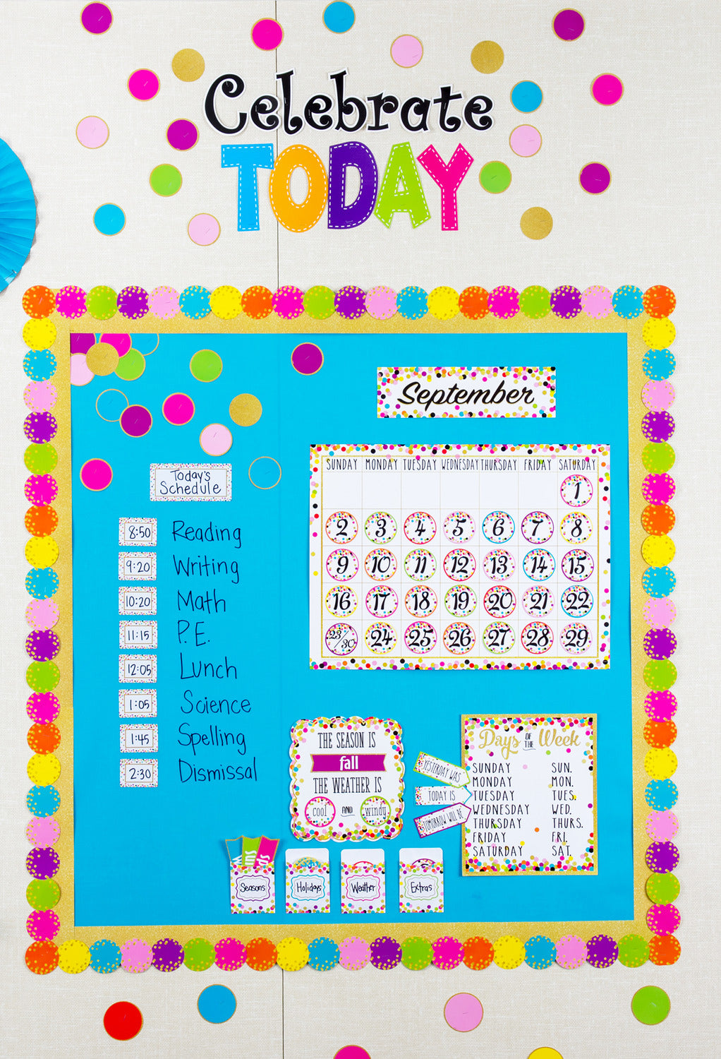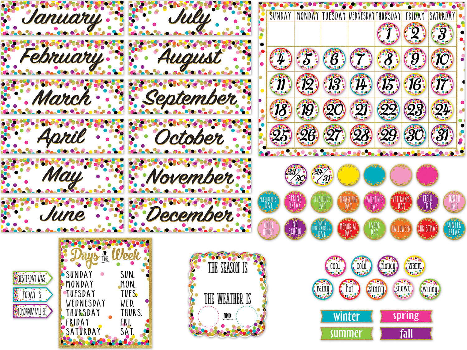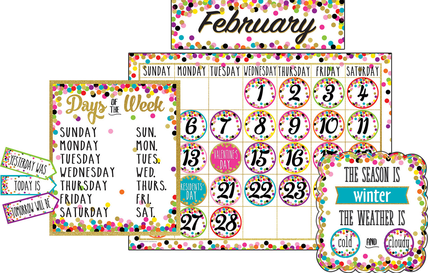 This stylish calendar display comes with easy-to-read number pieces, colorful monthly headers, and additional pieces for holidays and special occasions as well as yesterday, today, and tomorrow. Blank calendar measures 24" x 18". 84 total pieces.