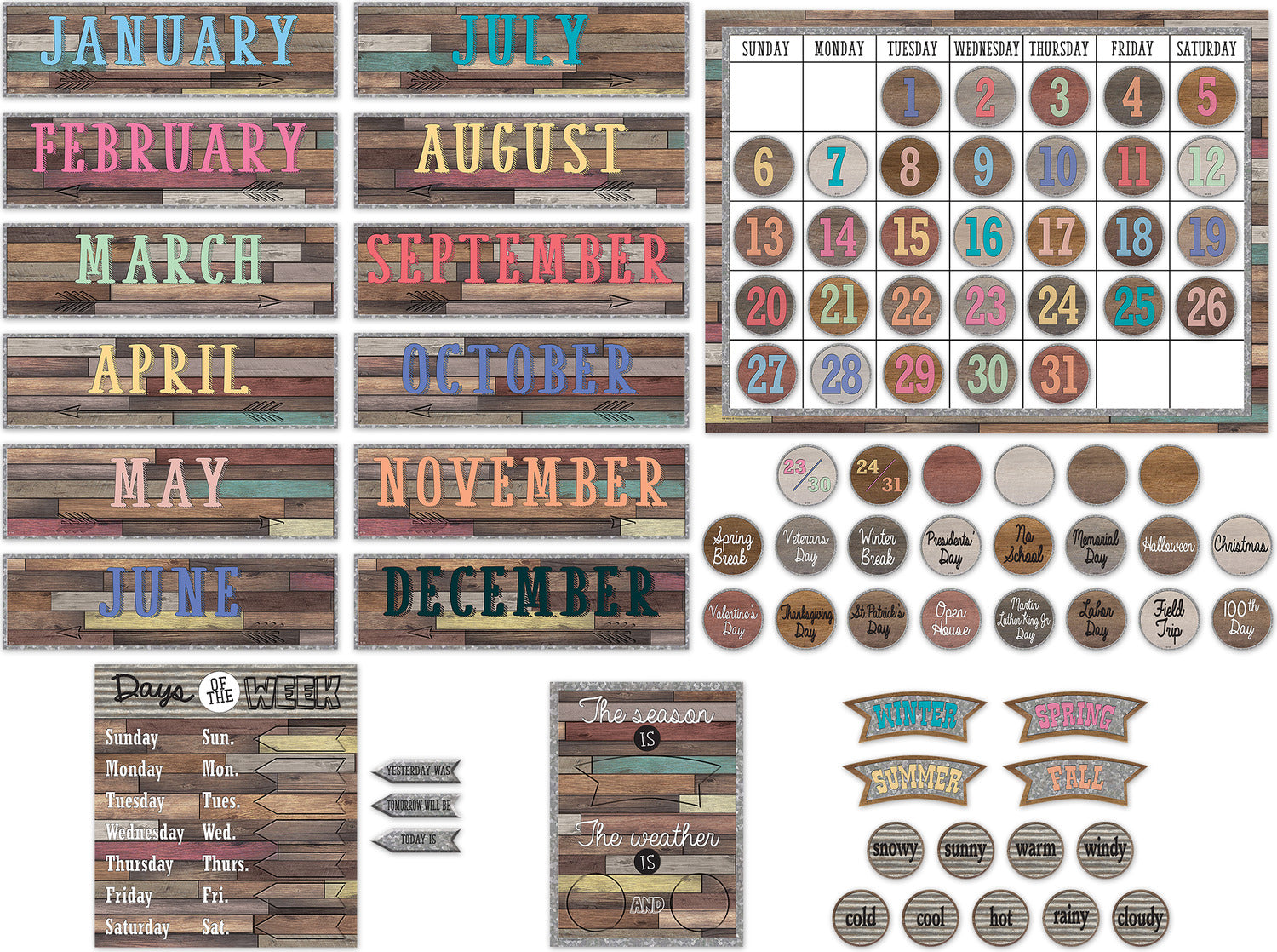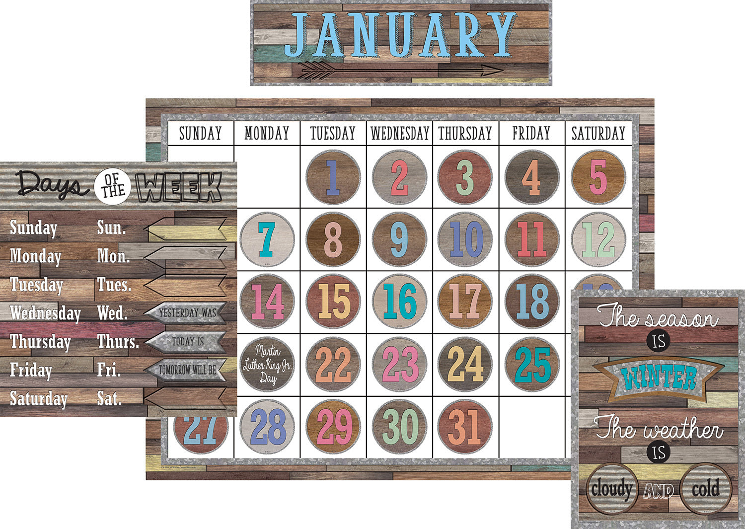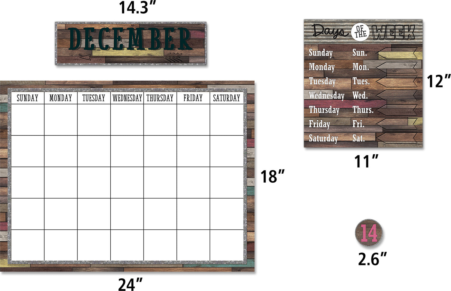 Regular price $17.99This rustic calendar display features a reclaimed wood and galvanized metal design. The set includes easy-to-read number pieces, colorful monthly headers, and additional pieces for holidays and special occasions as well as yesterday, today, and tomorrow. Blank calendar measures 24" x 18". 84 total pieces.