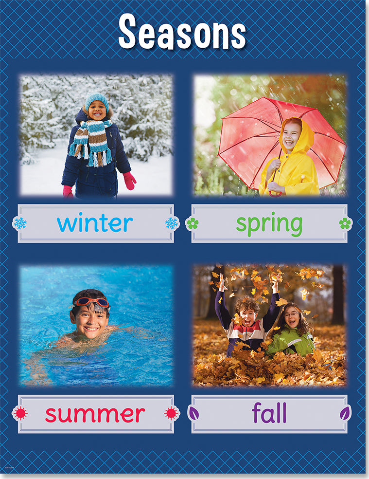 This chart provides a convenient classroom reference for the words for seasons of the year. Each season features a photograph of a child doing an activity appropriate for that season. Use this weather- and science-related classroom chart during any daily calendar lesson or circle time at a preschool, elementary school, or daycare. Gr. PreK-K.