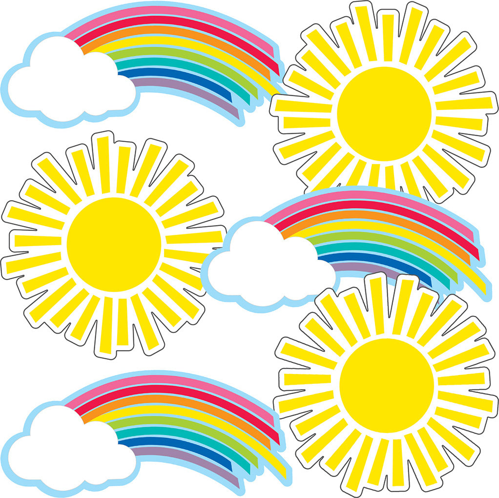 - MEASUREMENTS: This pack includes 36 assorted cut-outs (18 each: rainbow, sun). These cut-outs measure 6.7" x 3" (rainbows) and 5.2" x 5.24" (suns).