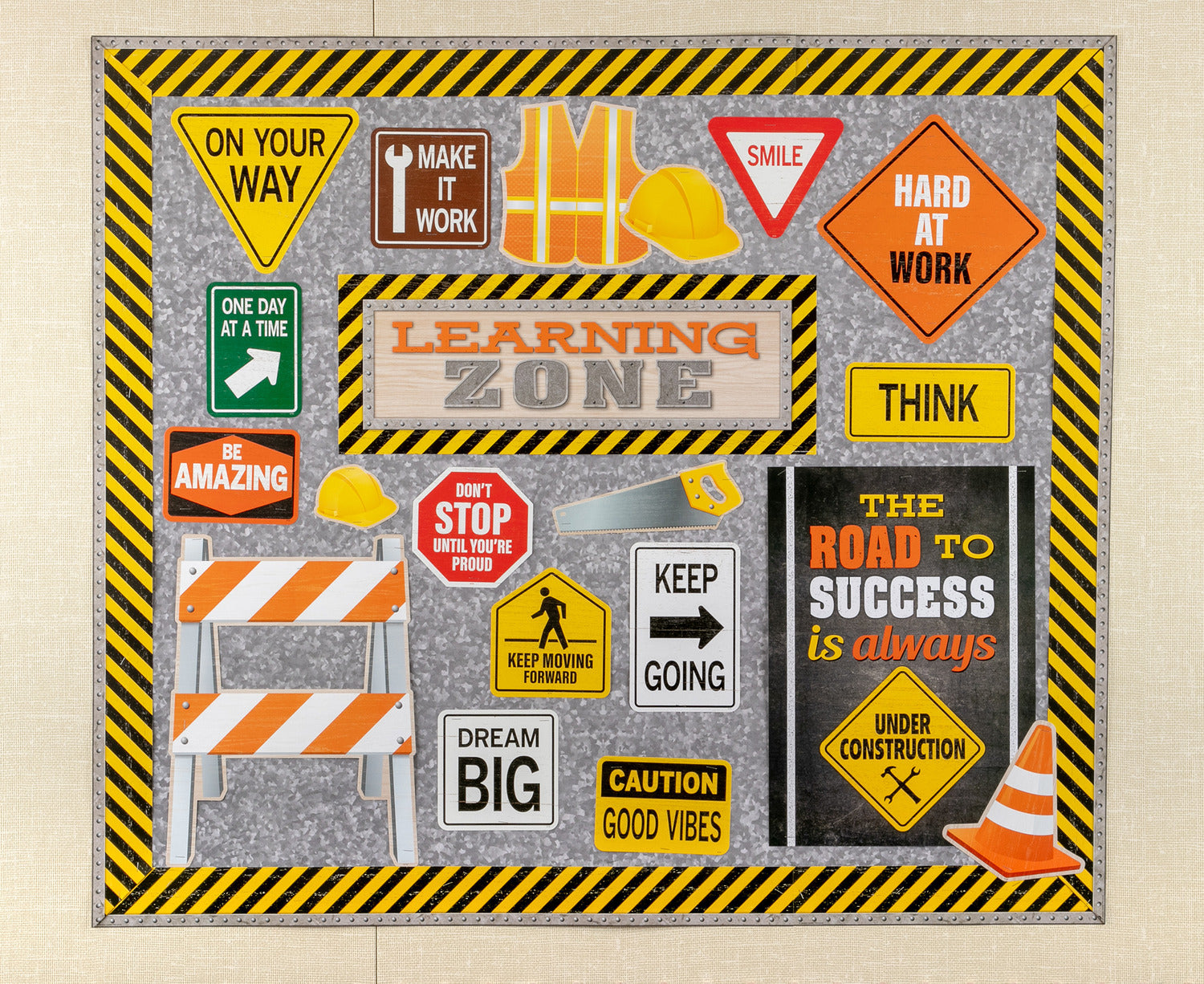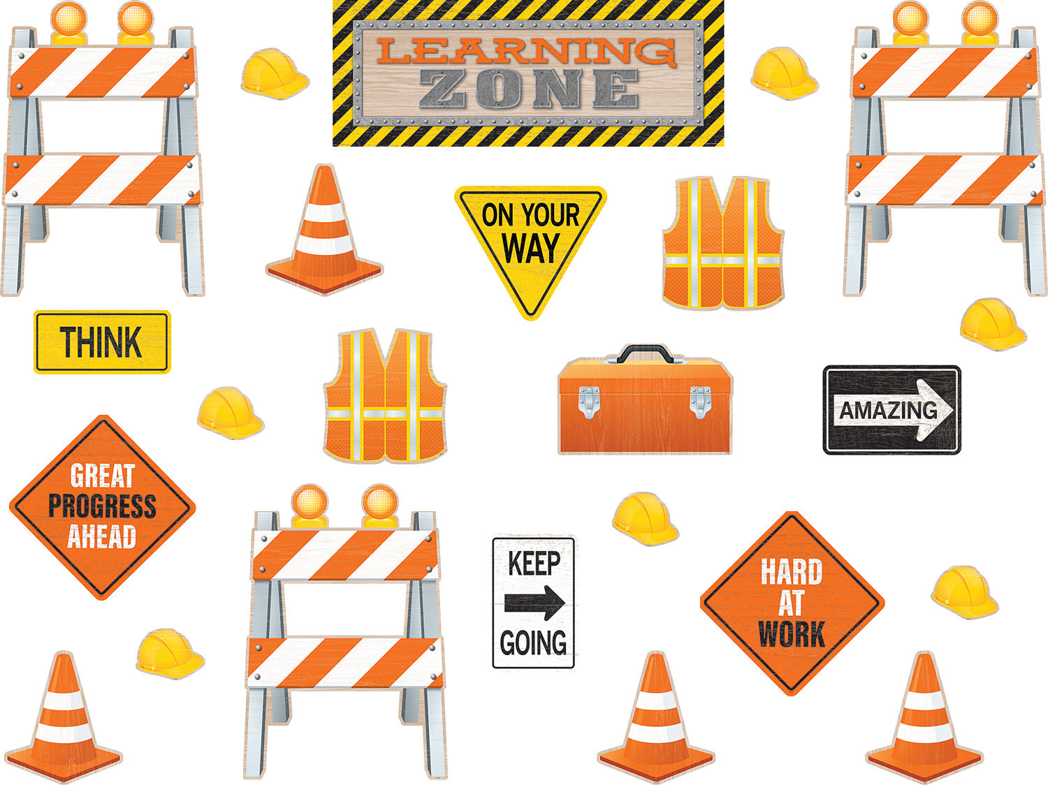 Your crew will love the positive messages and encouraging signs in this construction-themed display. Includes 1 "Learning Zone" header piece, 6 signs, 3 construction barriers with 6 matching lights, 4 traffic cones, 2 safety vests, 1 toolbox, and 37 hard hats. Barriers with lights on top measure 12-1/2" x 18-1/2". 60 total pieces.
