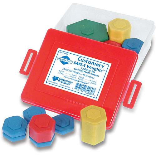 Use alone or together with metric weights for comparison activities. Set of hexagonal, plastic-coated weights contains eight 1 oz weights, 2 each of 4 oz and 8 oz weights, and one 1 lb. Weight. Stackable, color-coded weights with beveled edges come in a plastic storage box. Grades 3+