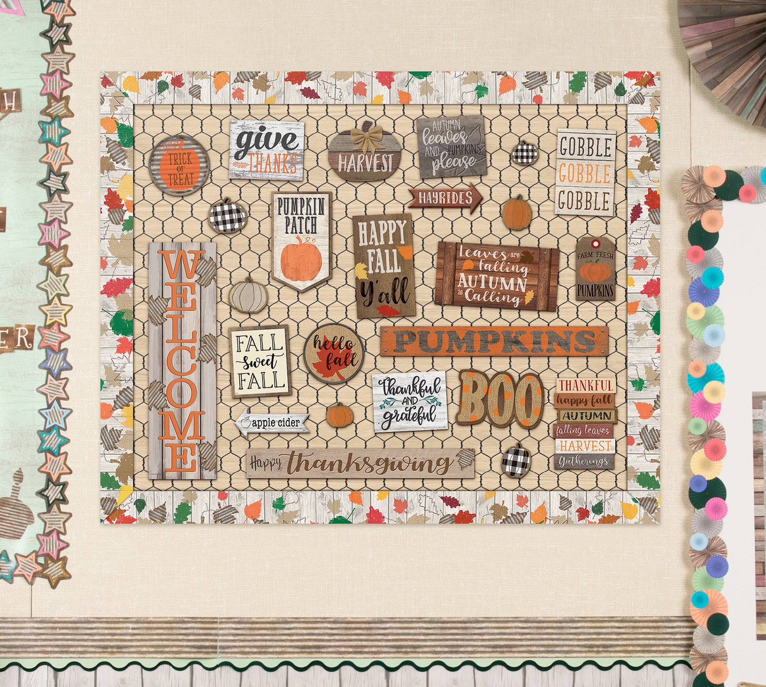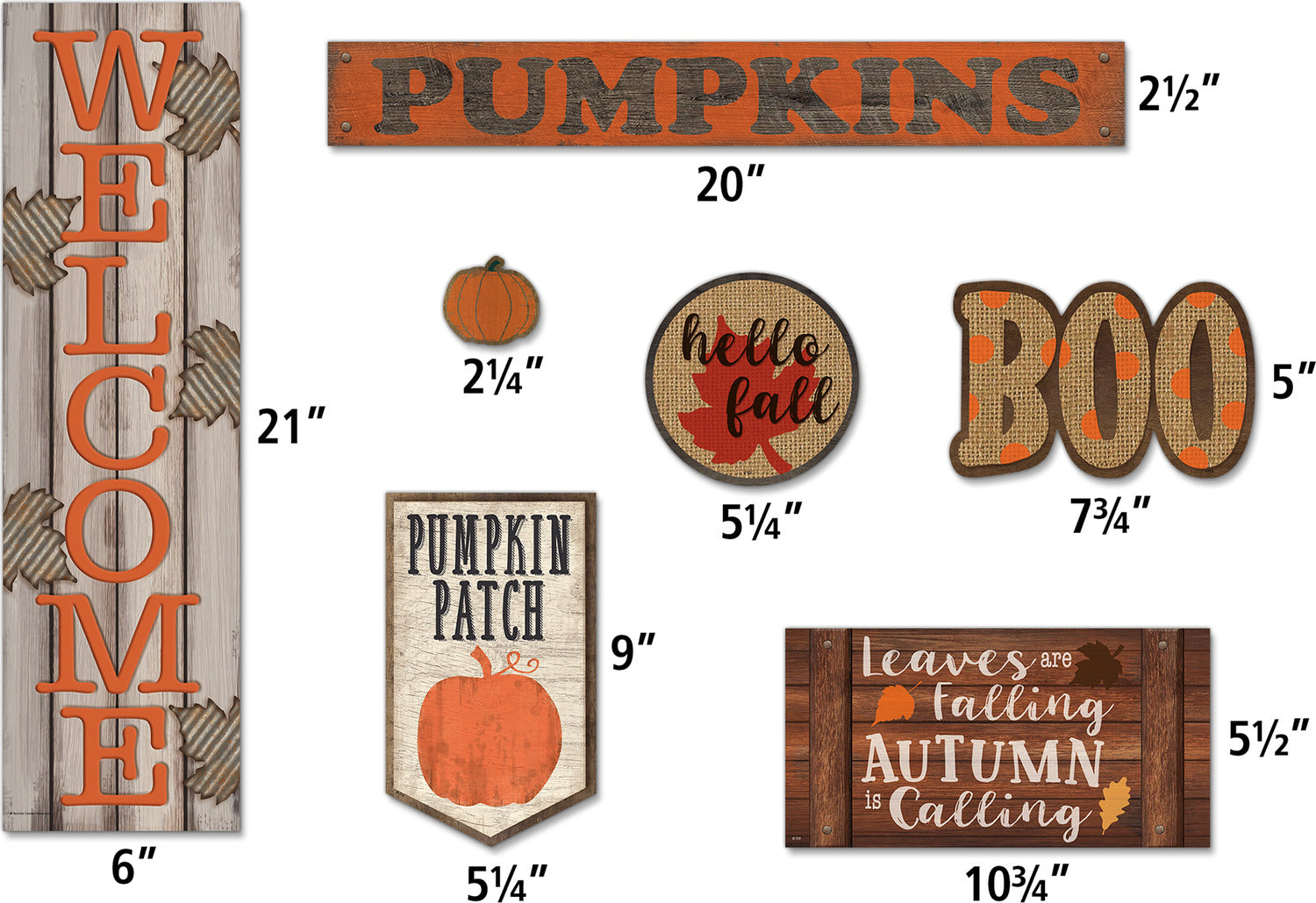 Regular price $11.99Celebrate everything there is to love about fall with this mini bulletin board set. This farmhouse-inspired set features rustic signs with pumpkins, leaves, and fun sayings in warm autumn colors. Largest piece measures 21" x 6". 25 total pieces.