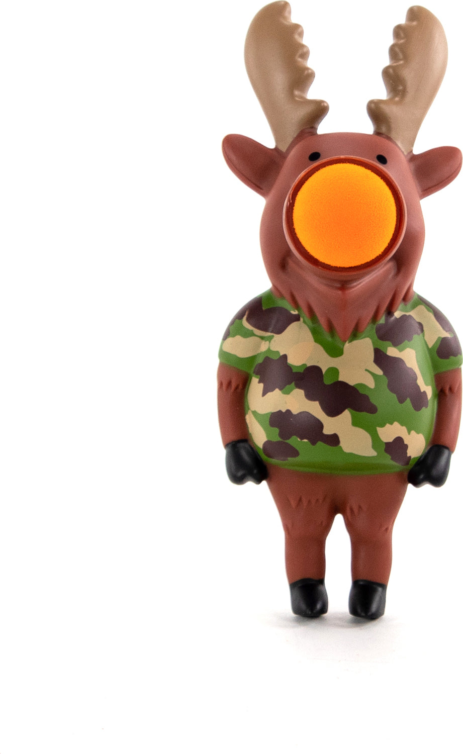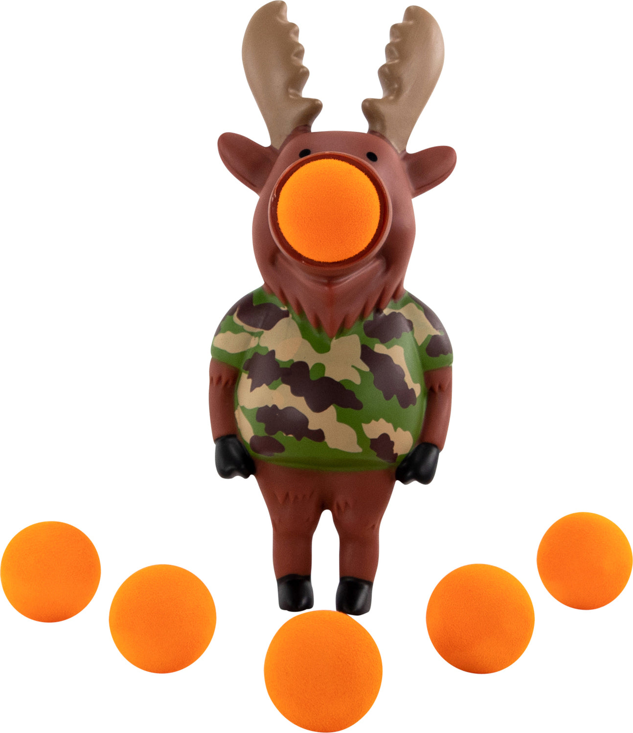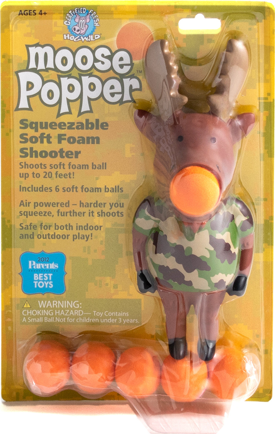 Grab that Moose by the mid-section and give him a squeeze! That sudden air pressure launches a soft foam ball up to 20 feet. The harder you squeeze, the faster and farther the ball shoots out. Includes six soft foam balls and convenient carry net. Works with all Power Popper refills.