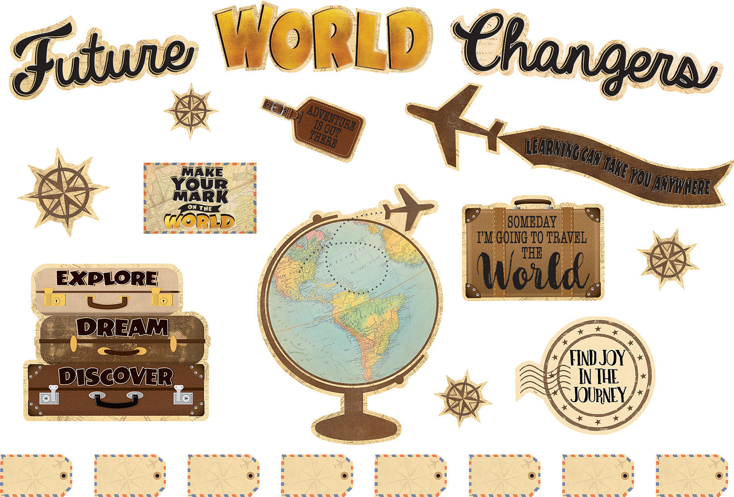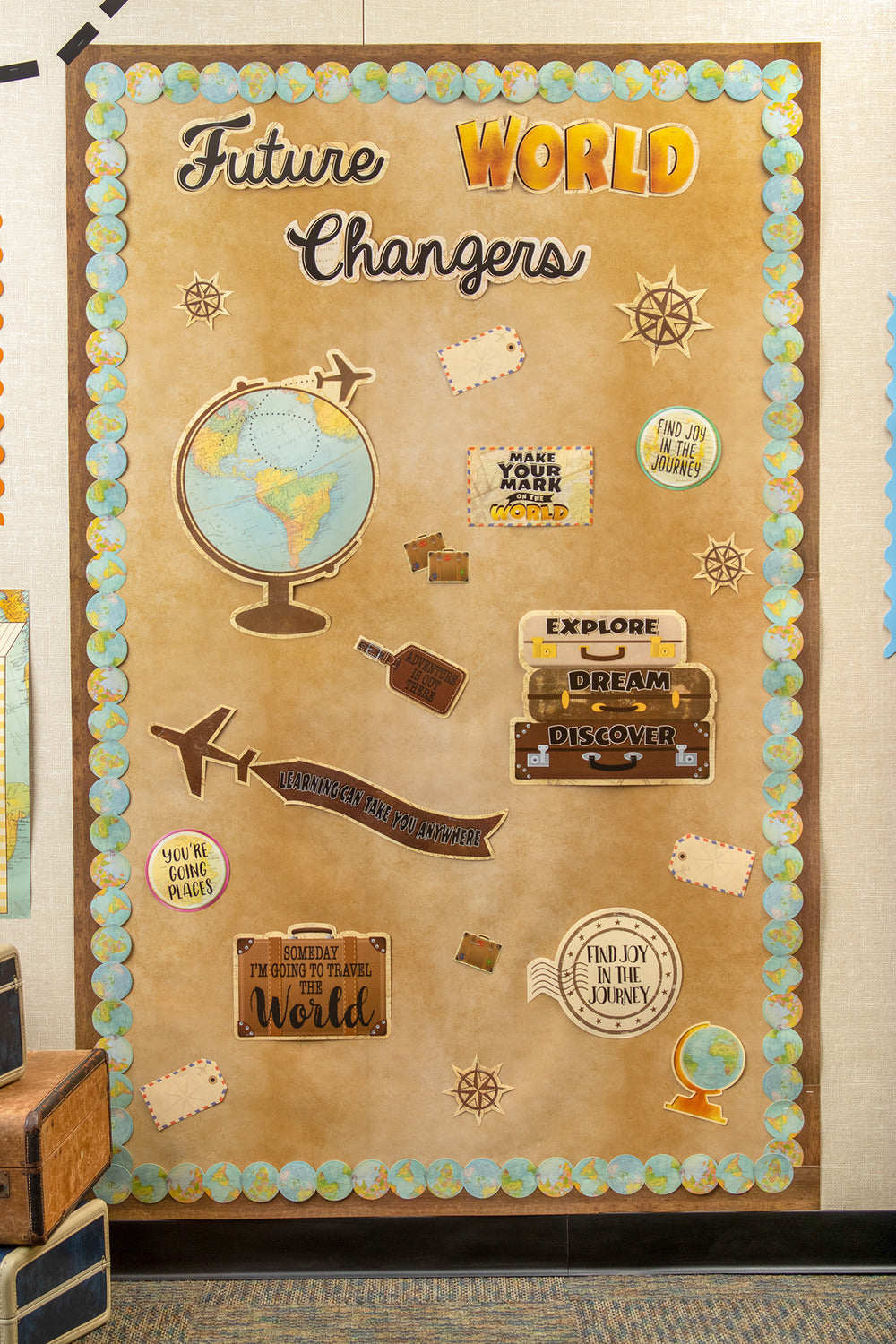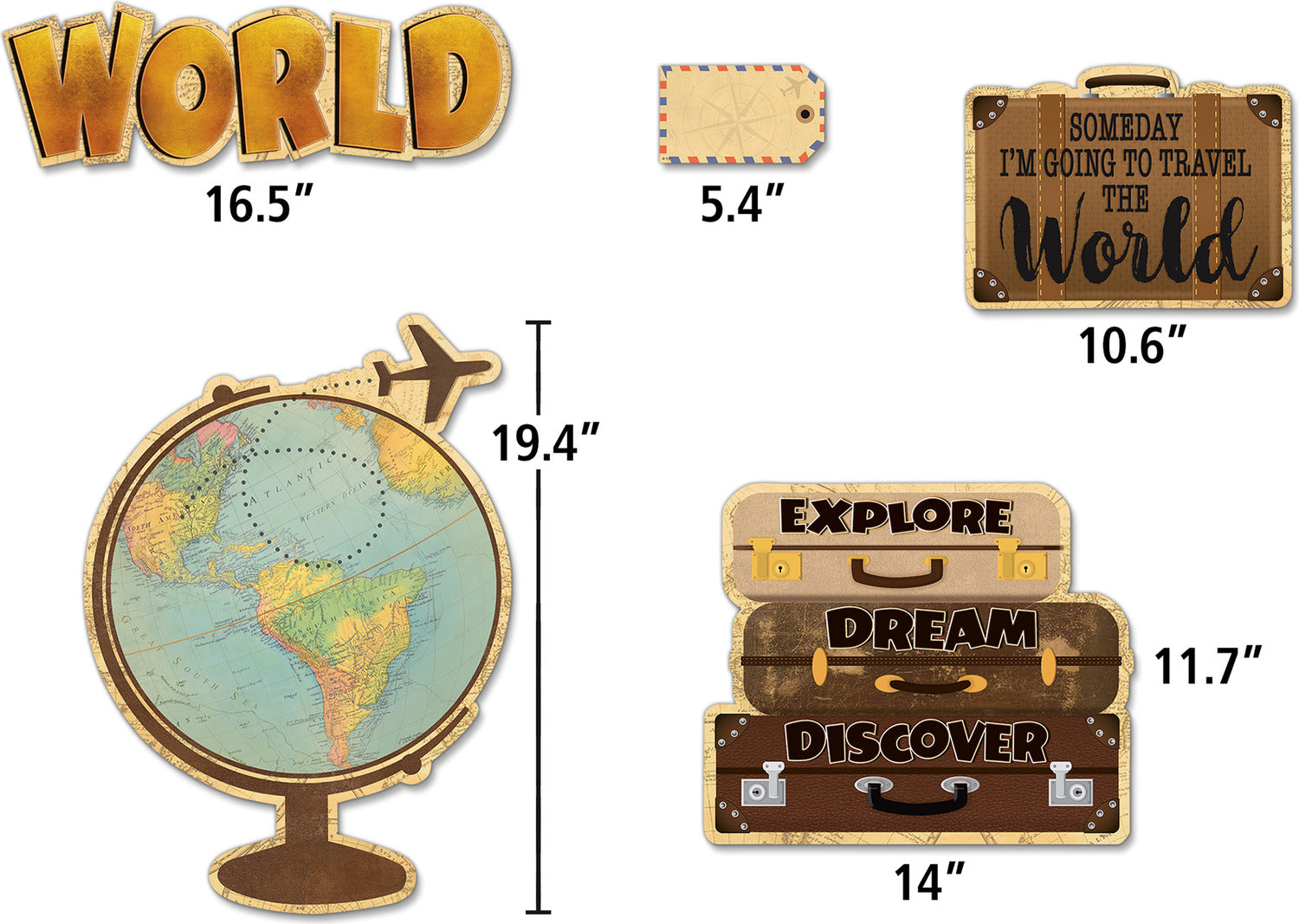 Regular price $17.99Your adventurous explorers will be ready to take on the world with this captivating bulletin board. The vintage-looking accents and inspiring messages will encourage them to explore, dream, and discover new worlds! Globe measures about 14" x 19-1/2". 48 total pieces including 34 tags.
