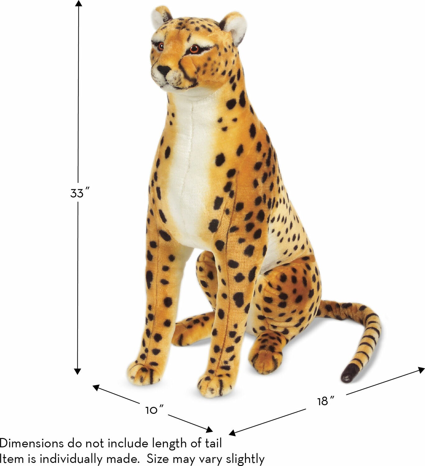 Regular price $97.99Beauty and elegance define cheetahs in the wild. This tame cheetah, over four feet from the tip of its nose to the tip of its tail, is content to sit by your side. Featuring excellent quality construction and attention to details, noticeable in the beautiful markings on its face, this cheetah is a lovable companion or bold decorating accent.