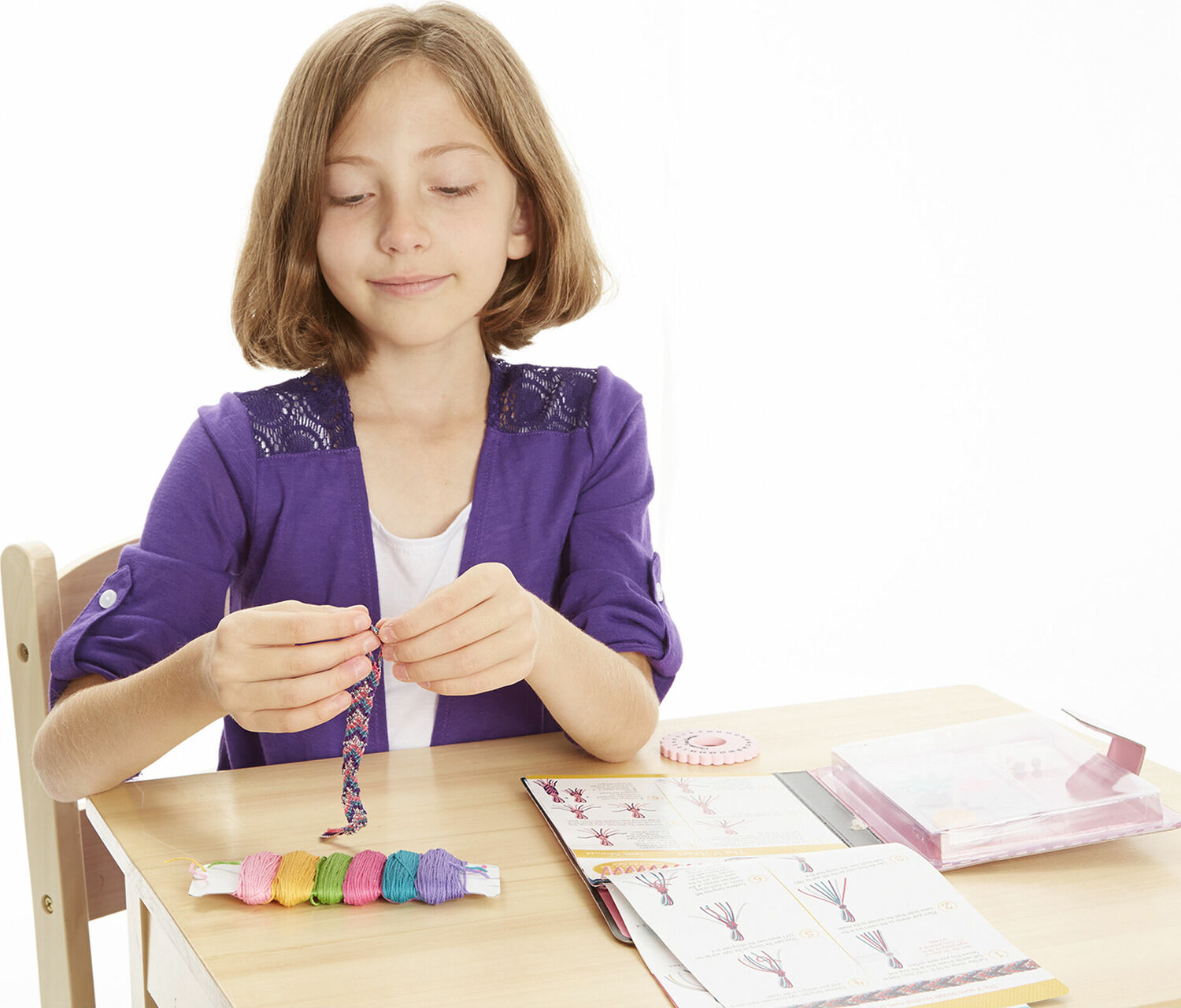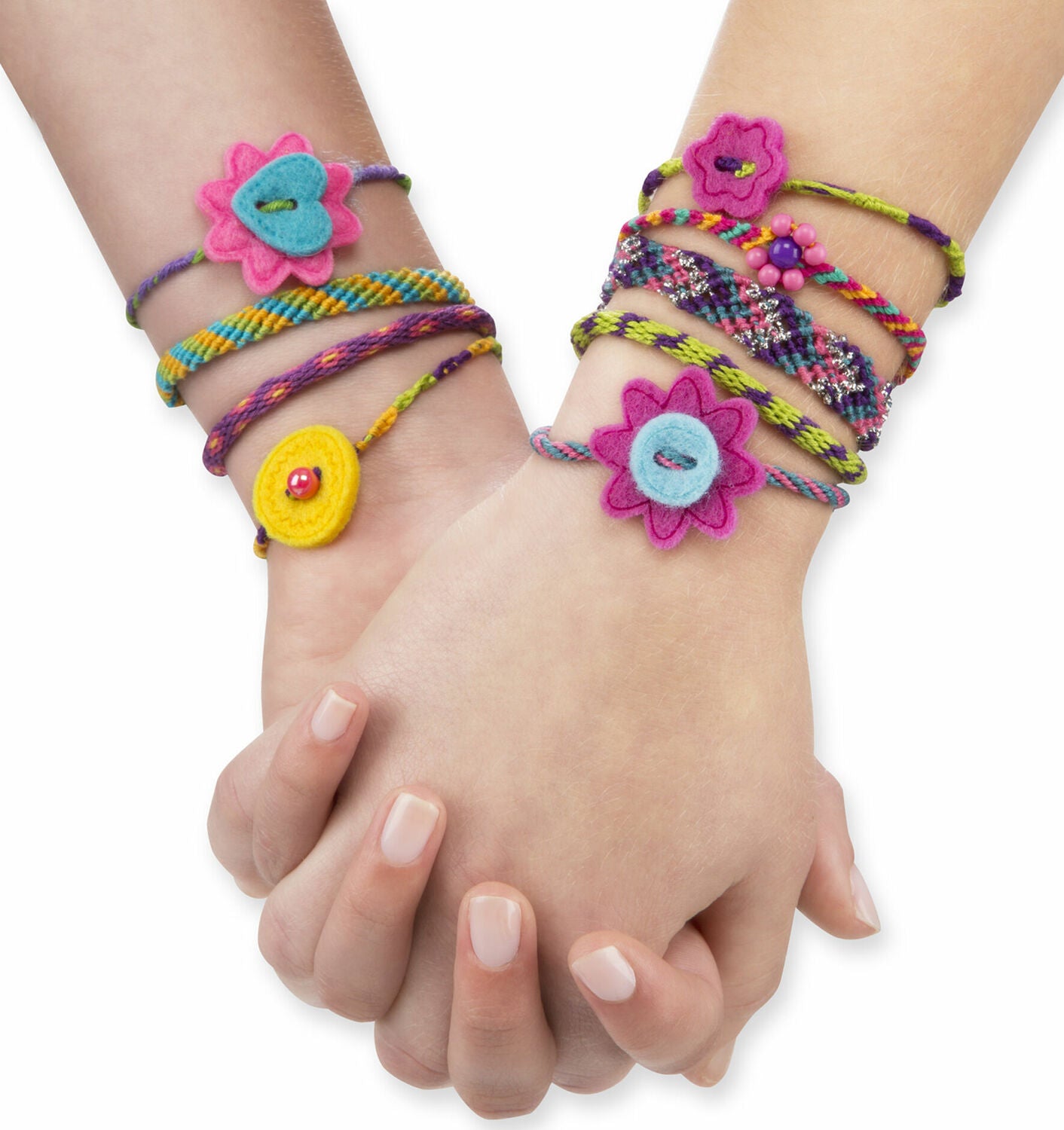 Regular price $12.99From simple knots to tricky patterns, this activity set guides kids through 10+ cool friendship bracelets! Organized from beginner to advanced, each style is covered step by step in full-color illustrated instructions, including variations and helpful hints. The range of styles lets junior crafters progress at their own pace, mastering each design as they use the soft, vibrant string to complete a selection of bracelets . . . or skip ahead to take on a new challenge using the included double-sided foam loom or beads and felt charms! A handy ruler for reference is printed right on the back cover, and everything stores neatly in a clear plastic compartment. Includes plenty of materials to make cool bracelets to wear and share with friends!
