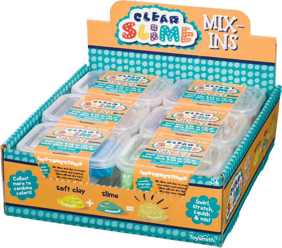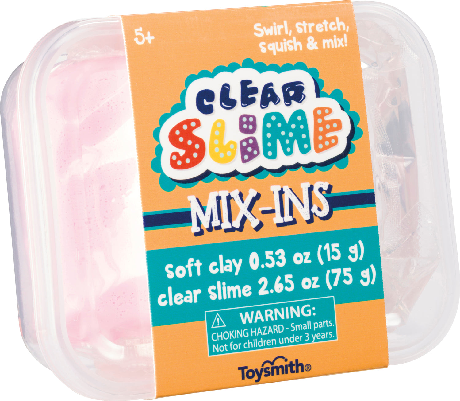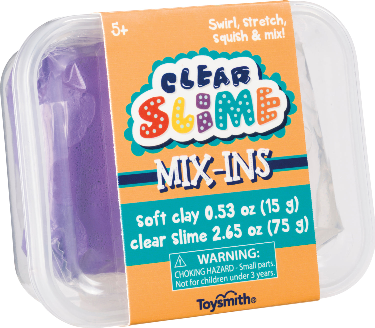 Update slime play by mixing soft clay into clear slime to create new textures and colors. Includes 0.53 oz. of soft clay and 2.65 oz of clear slime. Assorted colors. 5yr+