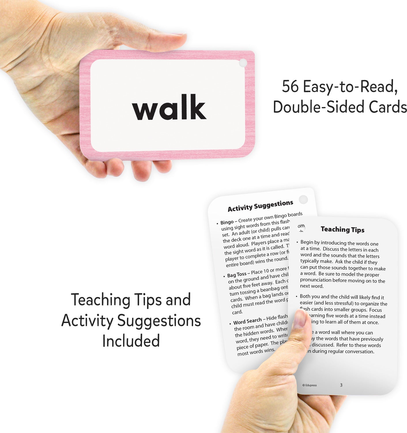 Each flash card set contains a collection of full-color, high-interest student cards as well as instructions and tips for the teacher or parent, suggested activities, and additional blank cards. Each card has a hole in the top corner that can be fit with a ring or string to help with organization and storage. Additionally, each card has one corner that is shaped differently than the others. By lining up the non-rounded corners, the flash cards can quickly be faced in the same direction. When applicable, flash card sets include answers in small print on the reverse side of each card.
