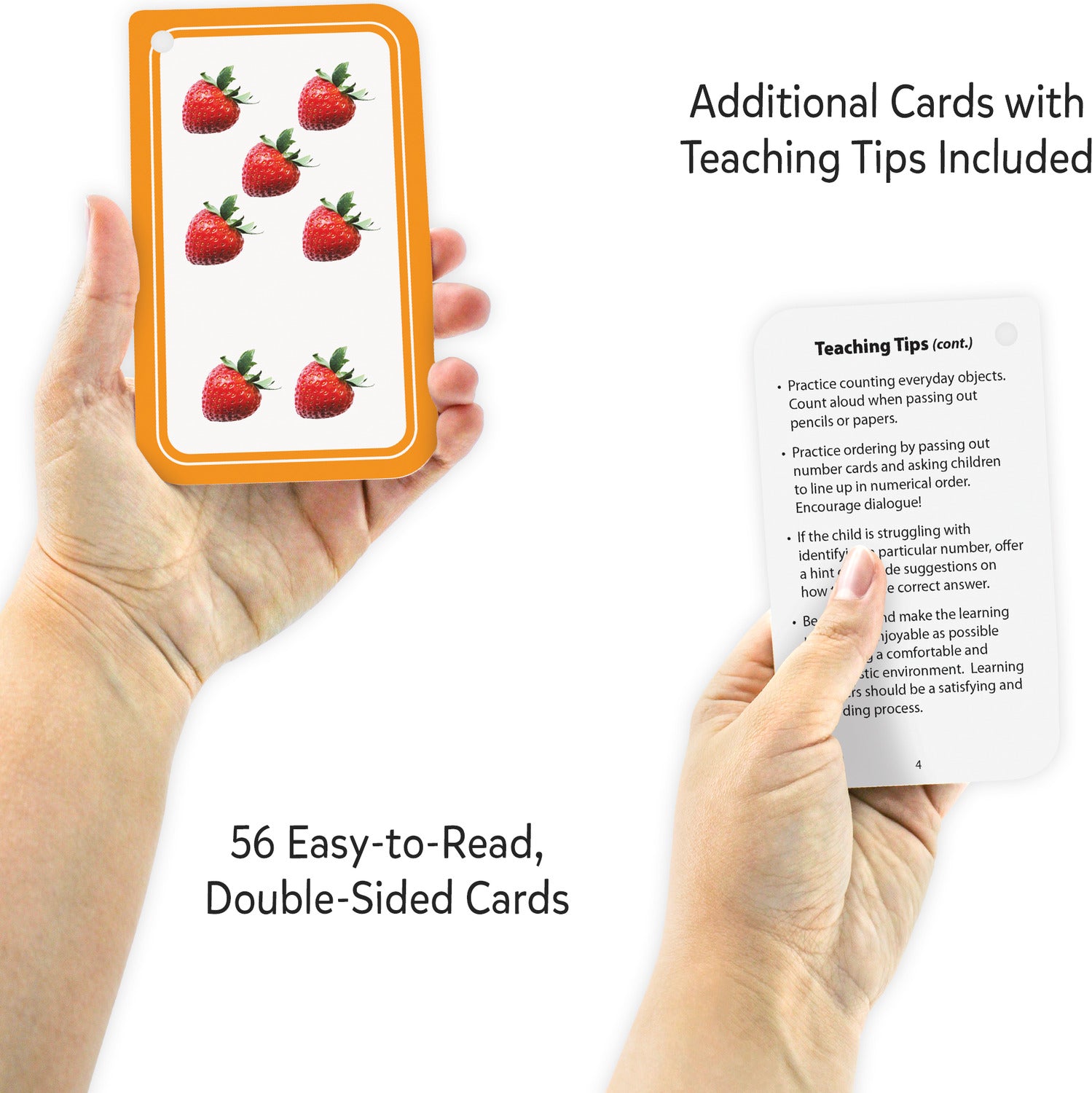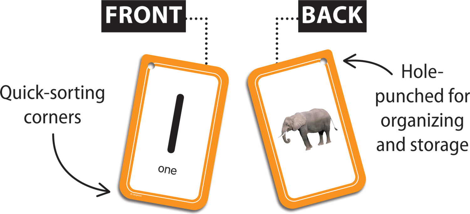 This flashcard set contains a collection of full-color, high-interest student cards as well as for instructions and tips for the teacher or parent, suggested activities, and additional blank cards. Each card has a hole in the top corner that can be fitted with a ring or string to help with organization and storage. Additionally, each card has one corner that is shaped differently than the others. By lining up the non-rounded corners, the flashcards can quickly be faced in the same direction.