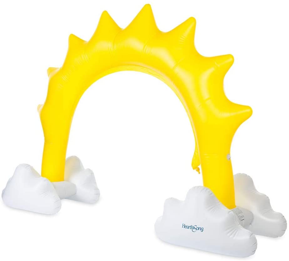 The bright yellow sunshine arch is anchored in white clouds designed with pockets to hold sand or water for increased stability (sand not included). Inflate the heavy-duty vinyl sprinkler in your backyard and safely attach a standard garden hose to the inner curve of the sunshine to create a continuous summer shower of watery fun. Invite friends, family, and neighbors over for a sunshiny afternoon of water play!