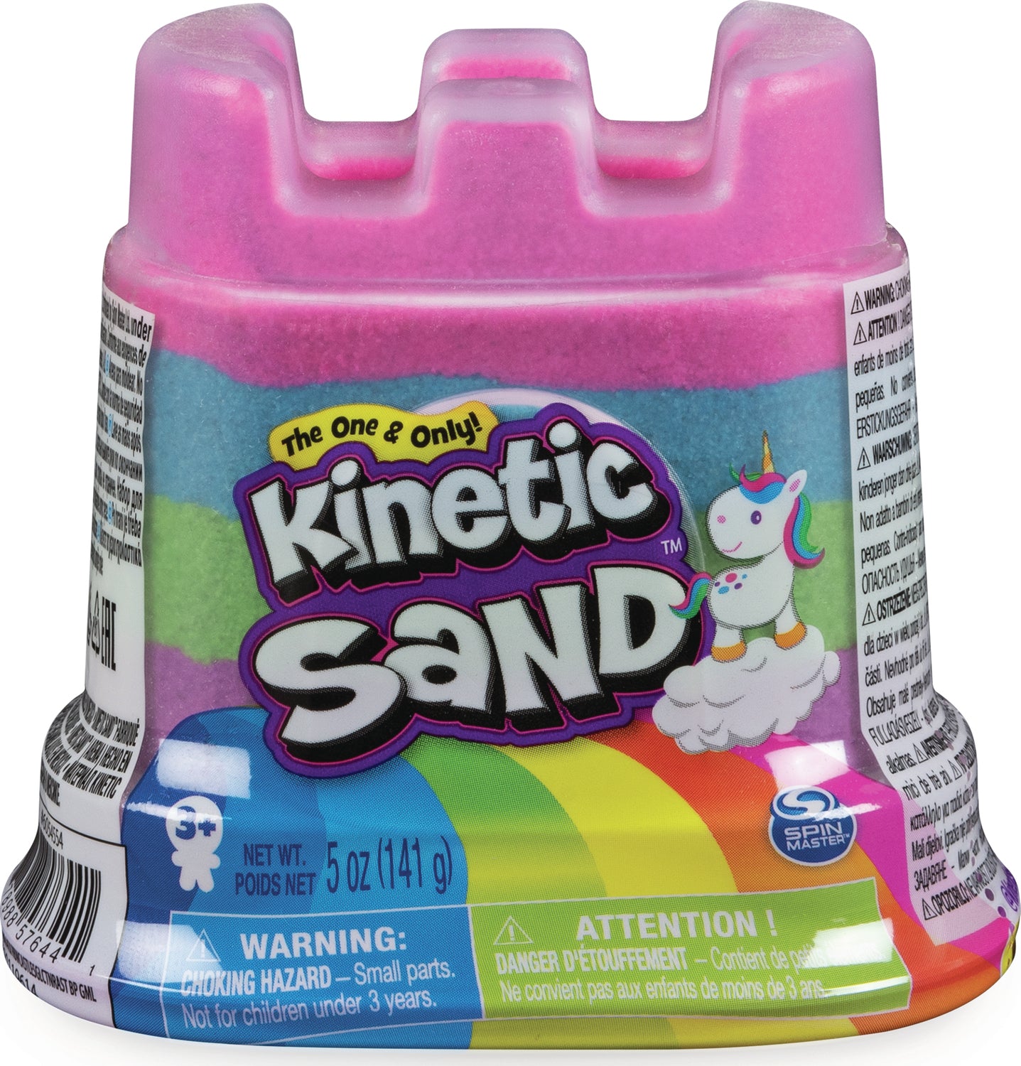 Regular price $4.99Mix, mold and create anything you can imagine with the Kinetic Sand Rainbow Unicorn Single Container! This 5oz castle container includes four colorful layers of Kinetic Sand – the original magical, moldable and mesmerizing sand. It flows through your hands and never dries out so you can play again and again. With a rainbow of Kinetic Sand colors (blue, green, purple and pink), you can squish it, mix it, cut it or mold it – the creative possibilities are endless! The unique Kinetic Sand formula makes it easy to shape and mold anything you can imagine. Mold a colorful castle using the included container and keep your Kinetic Sand packed inside when you’re finished playing.