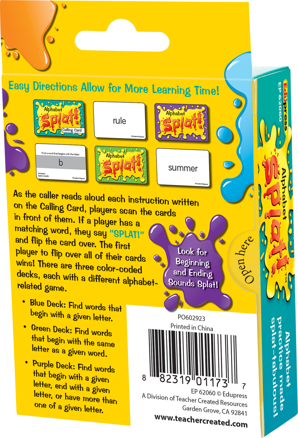 Regular price $17.99Fast-paced games provide practice for beginning reading skills! As the caller reads each card aloud, players scan the cards in front of them. If the player's card matches the clue, the player says "SPLAT!" and flips the card over. The first player to flip over all of their cards wins. With three color-coded decks, there are three games in every Splat! box. For 2-6 players. Set of 225 cards: 75 Calling Cards & 150 Answer Cards. Includes easy directions for more learning time!