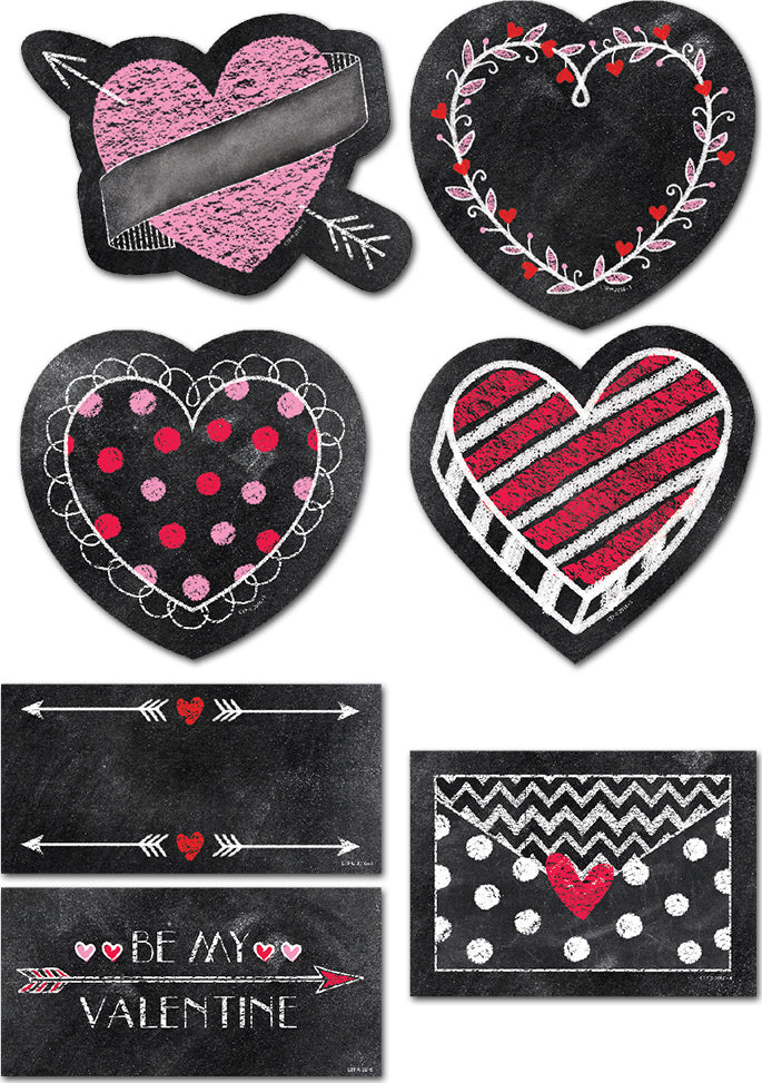 These Chalk It Up! Chalk Hearts 6" Cut-Outs are perfect for Valentine's Day, Friendship Month, classroom displays, crafts, holiday decorating, and more! The set includes a variety of charming chalk patterns and designsÊ featuring hearts, arrows, and even an envelope sealed with a kiss.