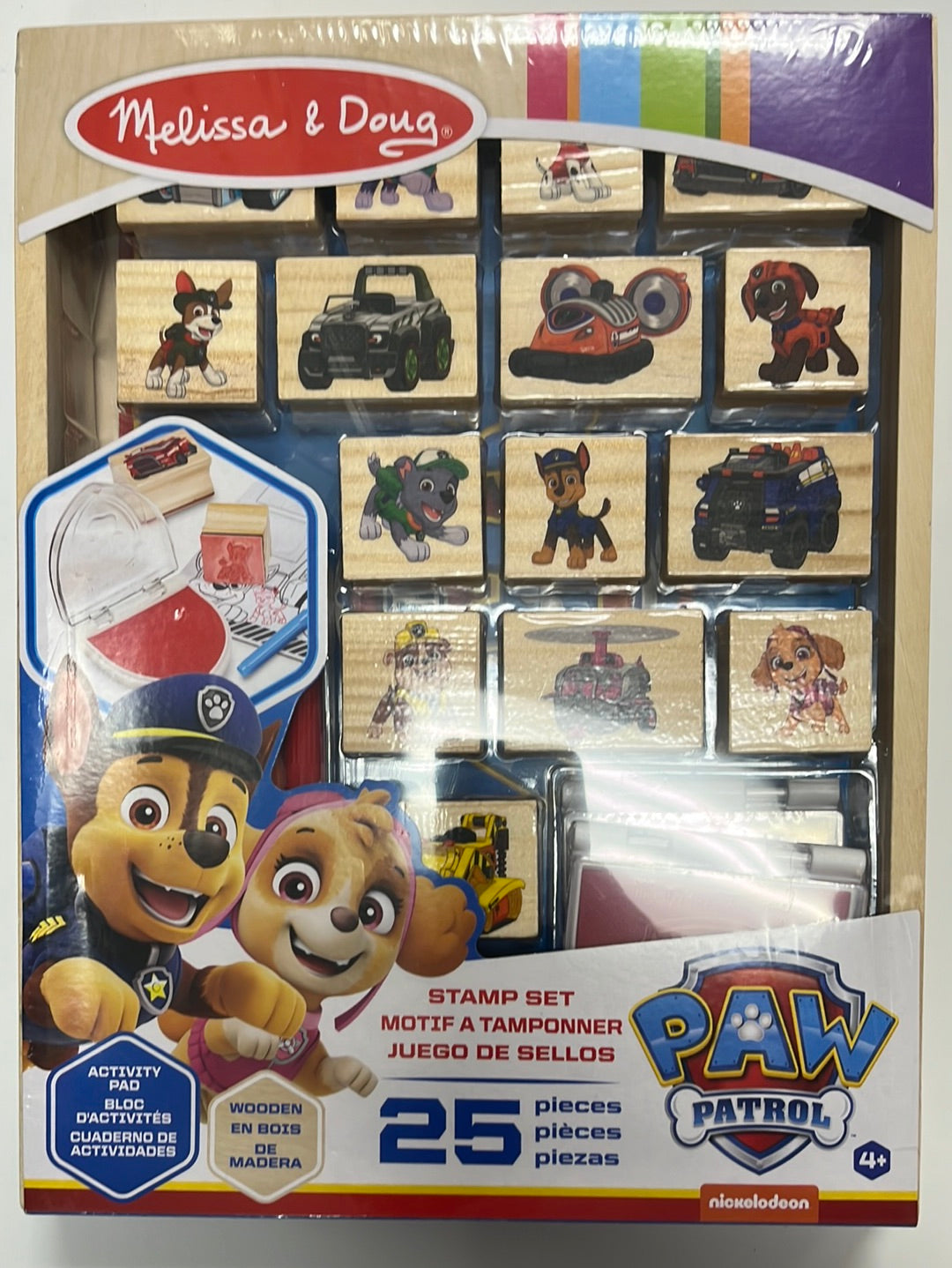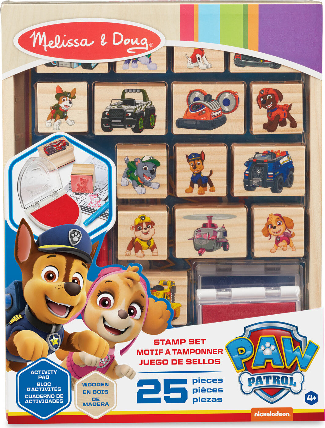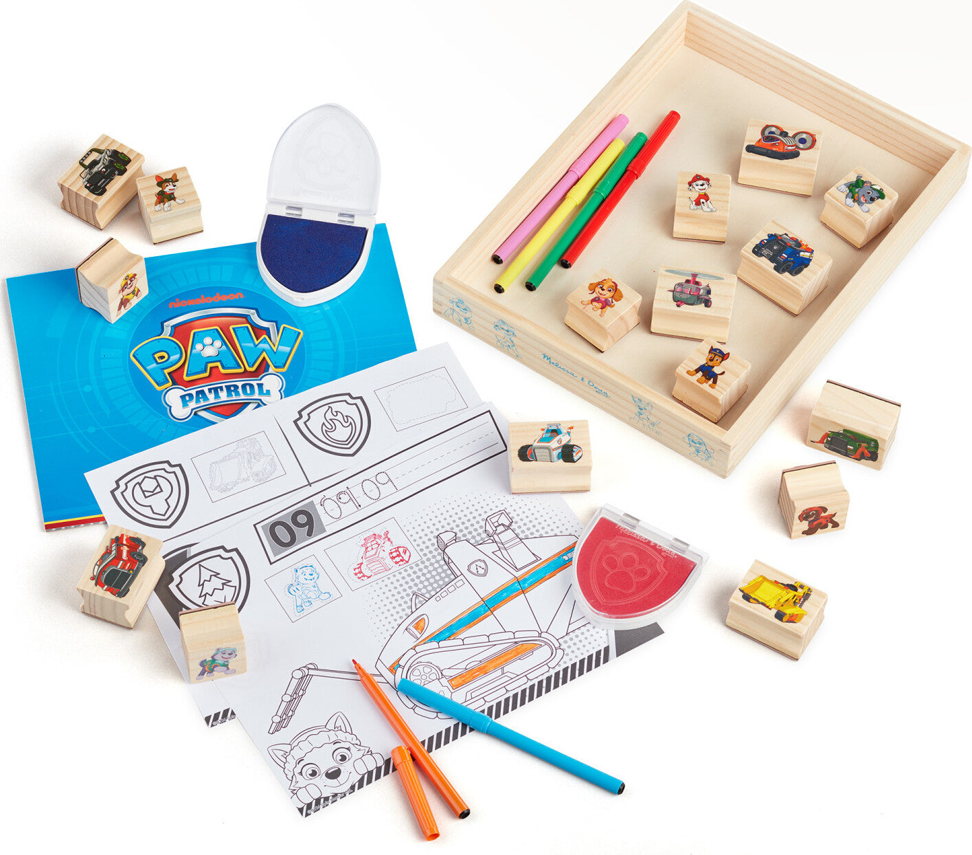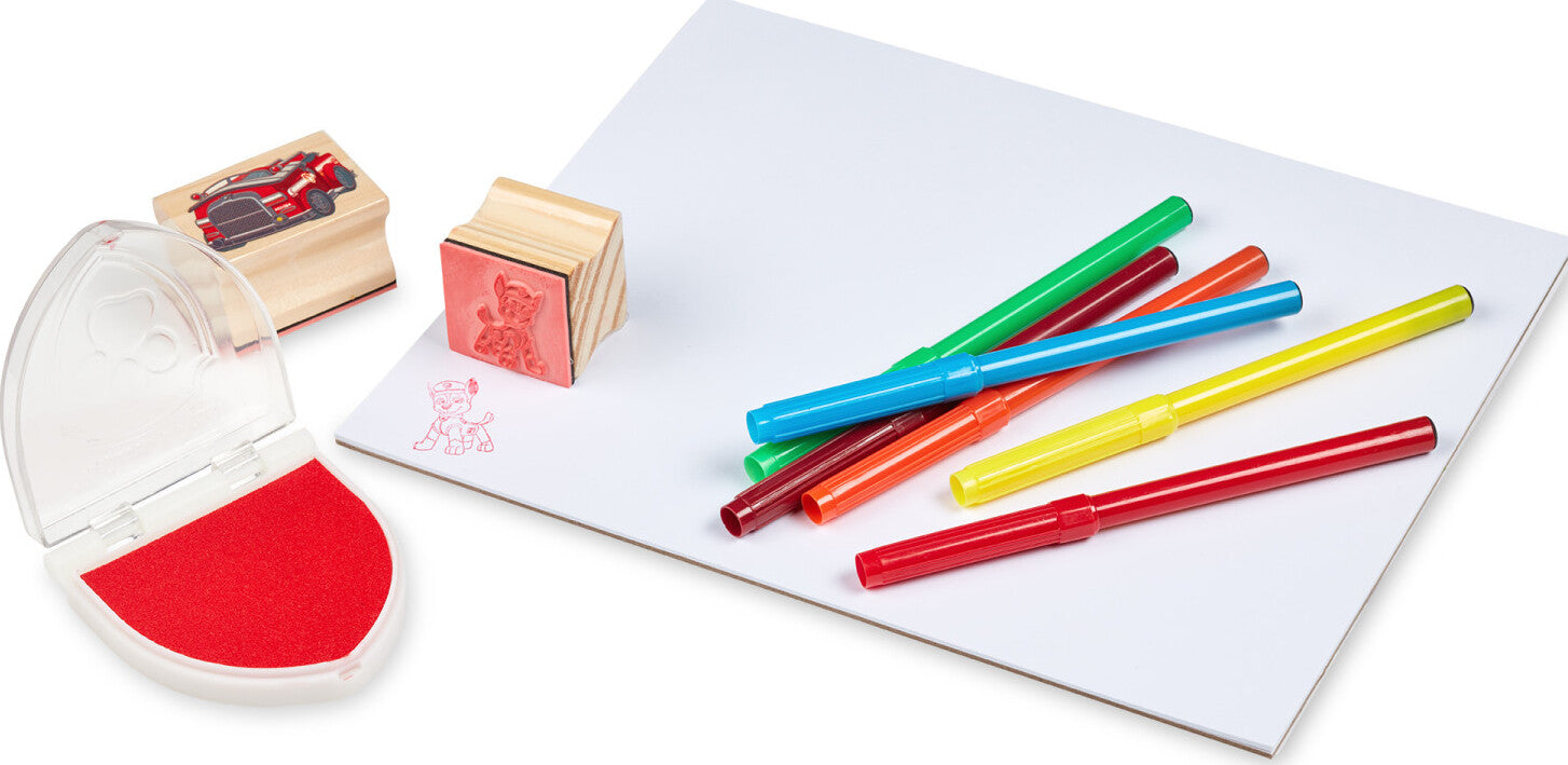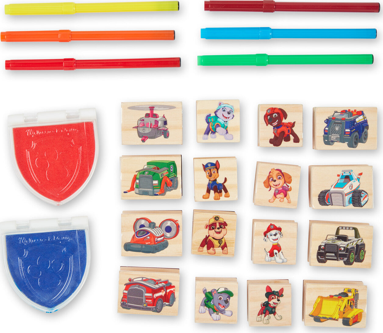 12 durable wooden stamps featuring PAW Patrol pups and vehicles. 2 shield-shaped washable ink stamp pads. 6 brightly-colored markers. Stamps, stamp pads, markers, and 12-page activity pad store in wooden crate.
