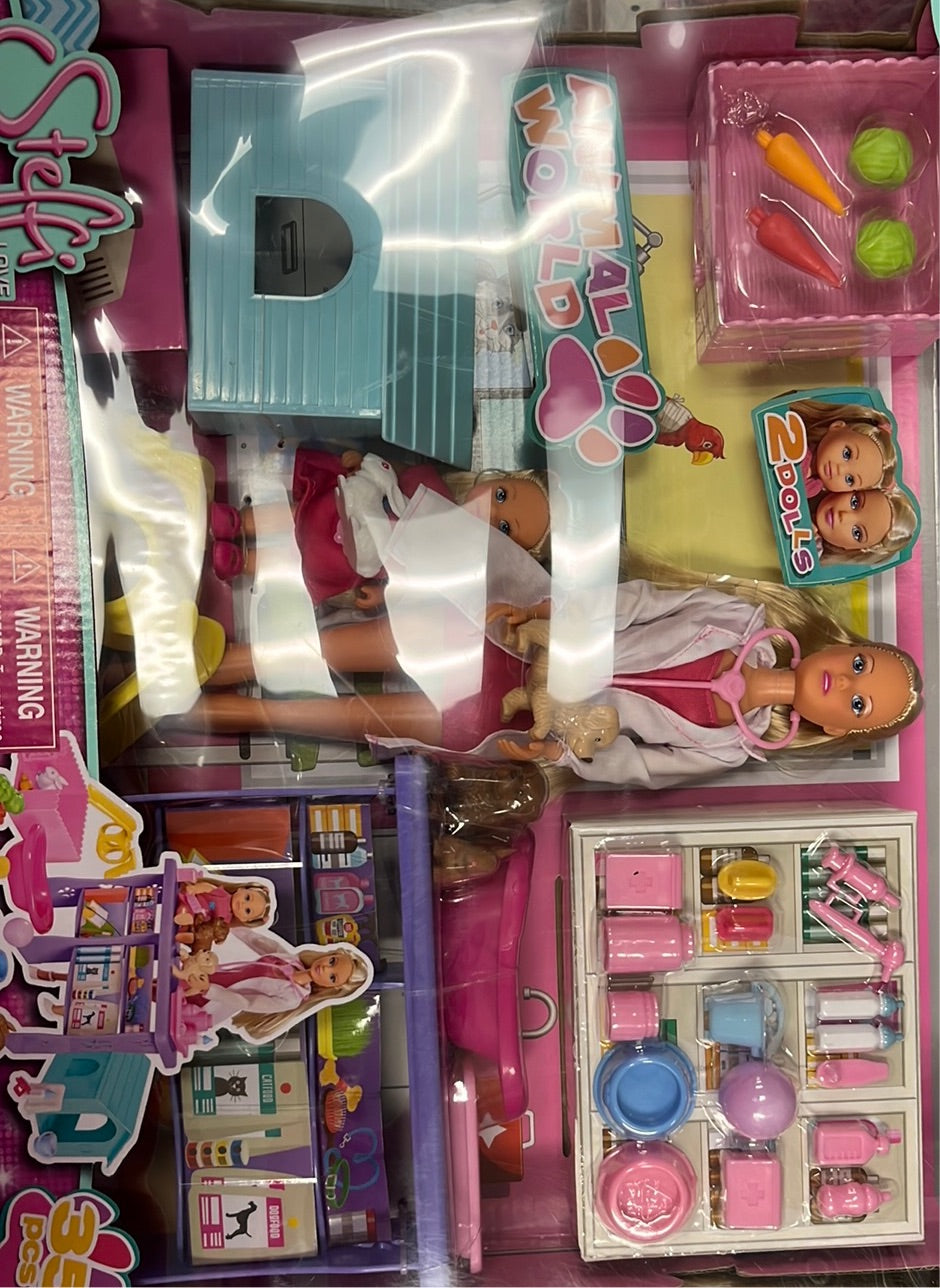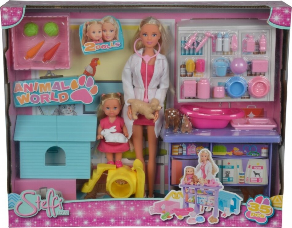 - Help Steffi and Evi look after animals who aren't feeling so great with this Animal World Playset. This set comes complete with Steffi wearing a veterinarian coat and stethoscope. Once you give the animals their checkup you can give them a treat before putting them either in the dog house or rabbit pen. Use the 35 accessories to groom and take care of the 2 puppies and 2 bunnies.