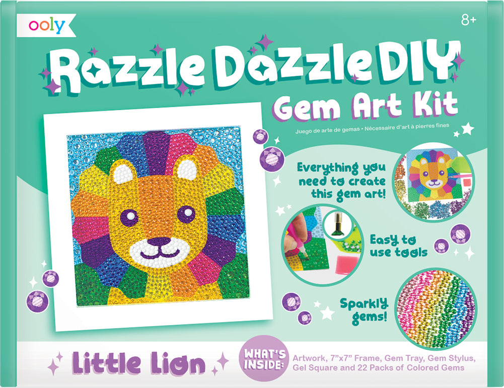 Regular price $21.99Let the brilliance of gems make this Lil’ Lion shine! The Razzle Dazzle DIY Gem lion Art Kit has everything you need to make a dazzling piece of art, even the frame. Coded artwork (7x7 inches) of the adorable lion is sticky and ready for gem placement (no additional glue needed). Use the stylus with a dab of the gel to pick up the indicated gem and put it into place. All the colorful bagged gems are numbered like a puzzle so you know where they go. Use the gem tray so your gems can spread out allowing the stylus them pick up easier. When your artwork is fully gemmed place it into the included wooden frame that has a built-in easel and hooks! A complete DIY art kit for kids that promotes crafting and creatively learning. This Lil' Lion gem Art Kit makes the perfect gift!Razzle Dazzle DIY Gem Art Kit - Lil’ LionCoded sticky artwork 7 x 7 inches (no additional glue needed)Coded colorful bagged gemsGem trayStylus and gelWhite wooden frame with built in easel and hooksSuitable for ages 8 and upSee how it works!