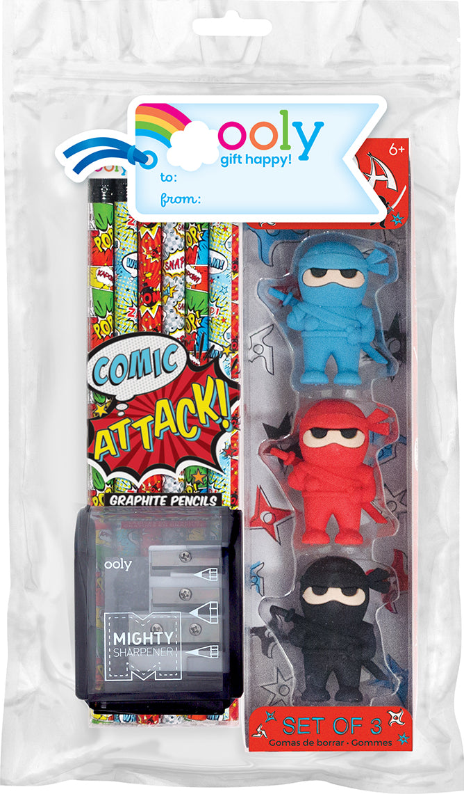 Regular price $22.99When you've got a story to tell and need the tools to write and draw it all, you need the Comic Attack Happy Pack. With the comic-themed barrels and #2 graphite pencils, you’ll find inspiration for all your notes and sketches. And with the super slick ninja erasers, a few quick strokes and mistakes are gone with a swoosh! And of course, all creative heroes need to stay sharp and clean, so the Mighty Sharpener is all you need to complete the pack. This pack is fantastic as a simple gift or party favor too!3 Ninja Erasers to attack your mistakes and wipe them out12 Comic Attack Graphite Pencils with #2 graphite for sketching and jottingMighty Sharpener to keep pencils sharp and contain the pencil shavings **all styles may not be available as pictured, a comparable substitution may be made