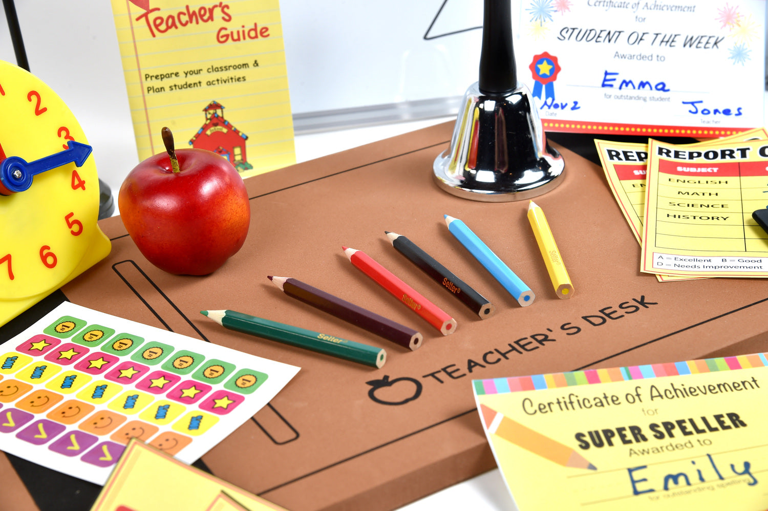 A realistic teacher and student role play set. Call the class to order, take attendance, write on the board, ring The bell, hand out grade cards, and much more. Kit includes an easy to clean desk blotter, USA map, bell, flag, pointer, write and wipe board, eraser, attendance list, name card, play clock, Certificate of Completion and much more. Includes everything you need to be a pretend teacher or student.