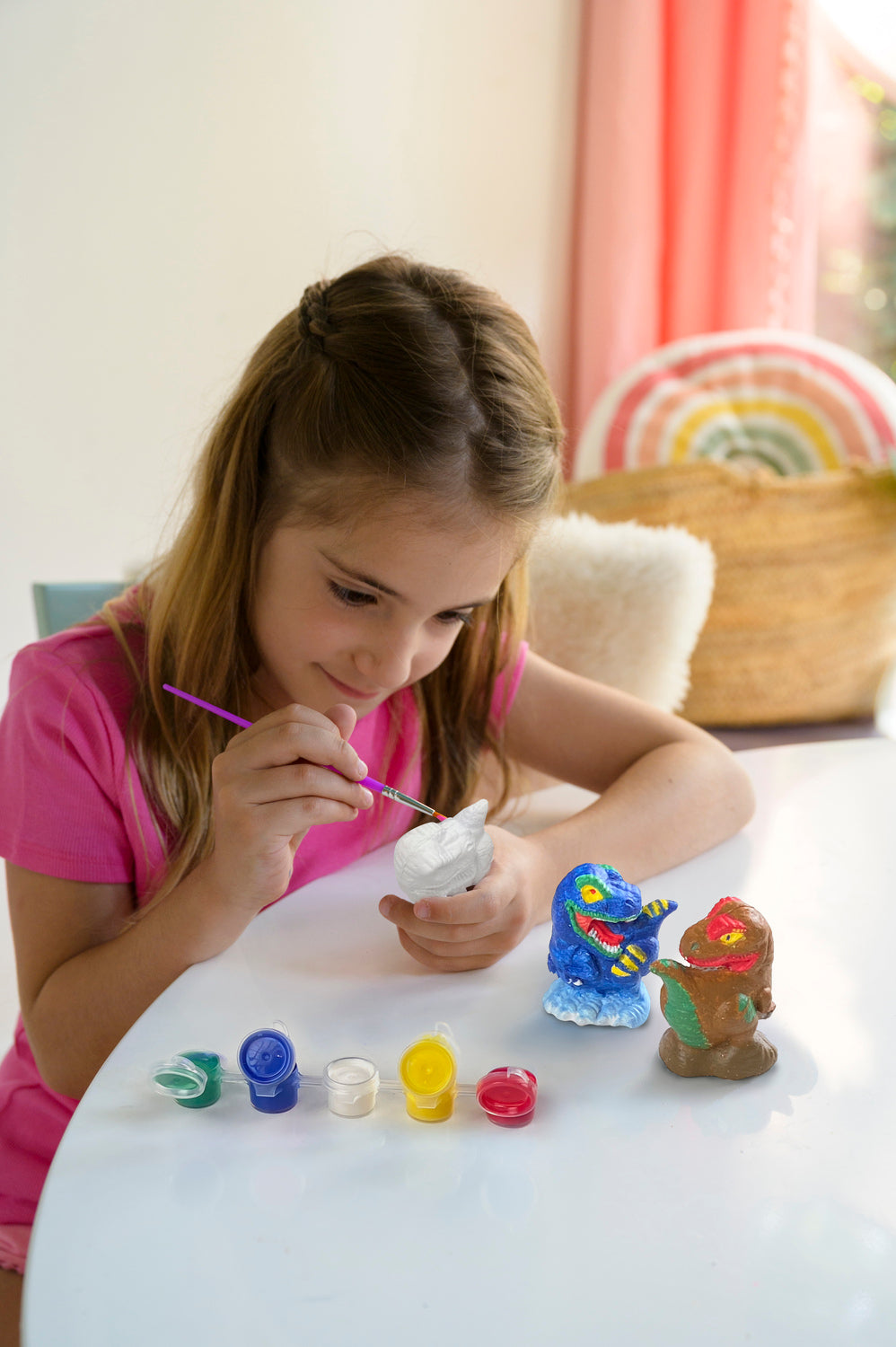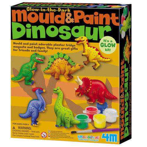 The 4M Glow-in-the-Dark Mold & Paint Dinosaur kit is a wonderful craft activity for dinosaur lovers. This mold and paint kit makes up to 6 glow dinosaur figures that can be turned into fridge magnets.