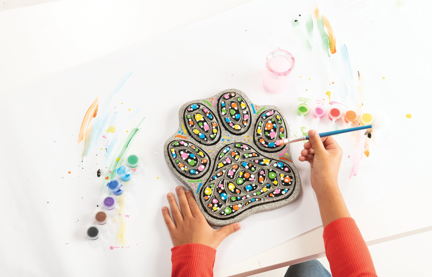 Regular price $38.99When you’re done painting, simply bake your stepping stone to help ensure a long-lasting, weather-resistant finish. Paint this paw print stone as a unique gift for dog lovers in your life or display it in your own backyard doggy haven! Kit contains 8.5” x 9” cement stepping stone, 12 paints, a paint brush and painting guide.