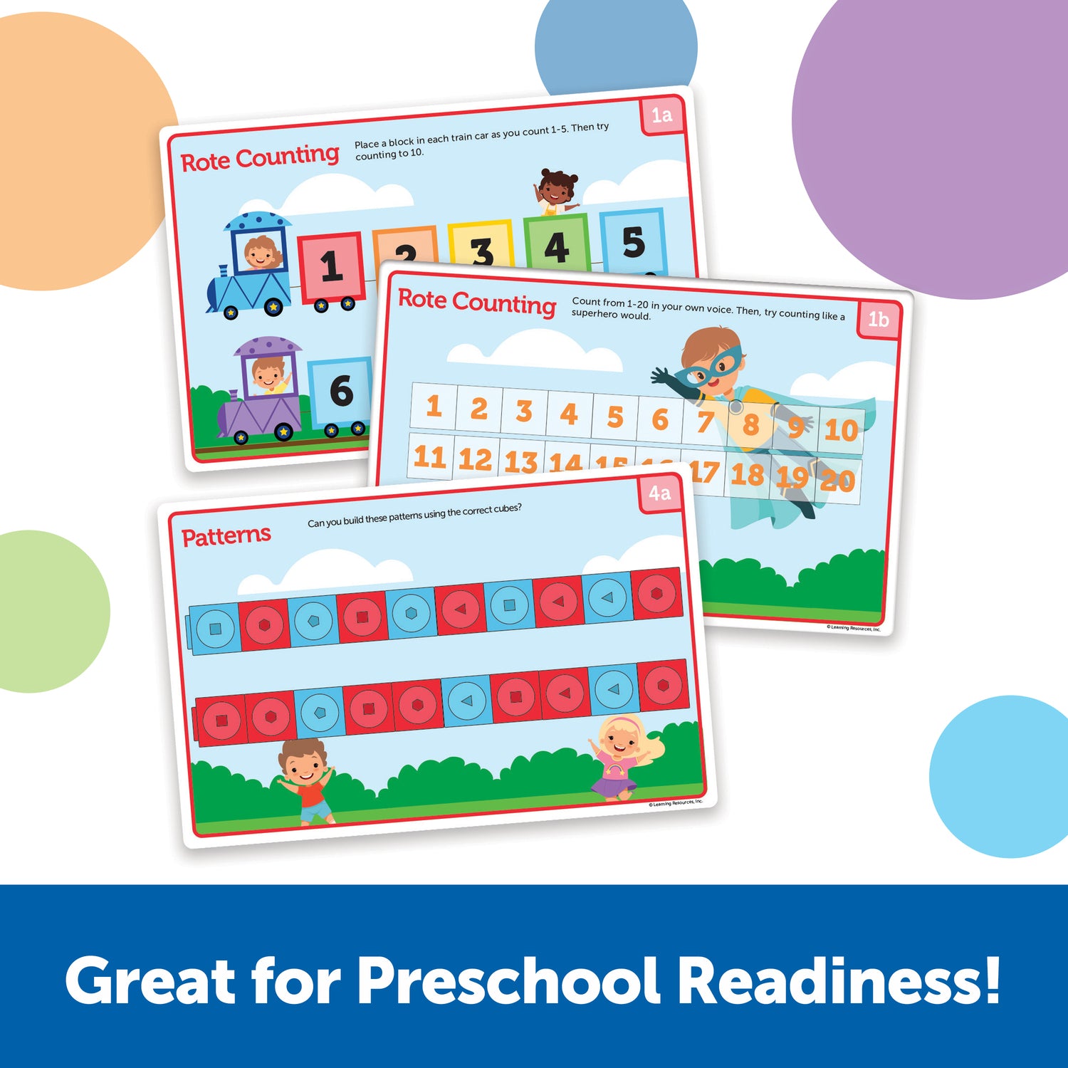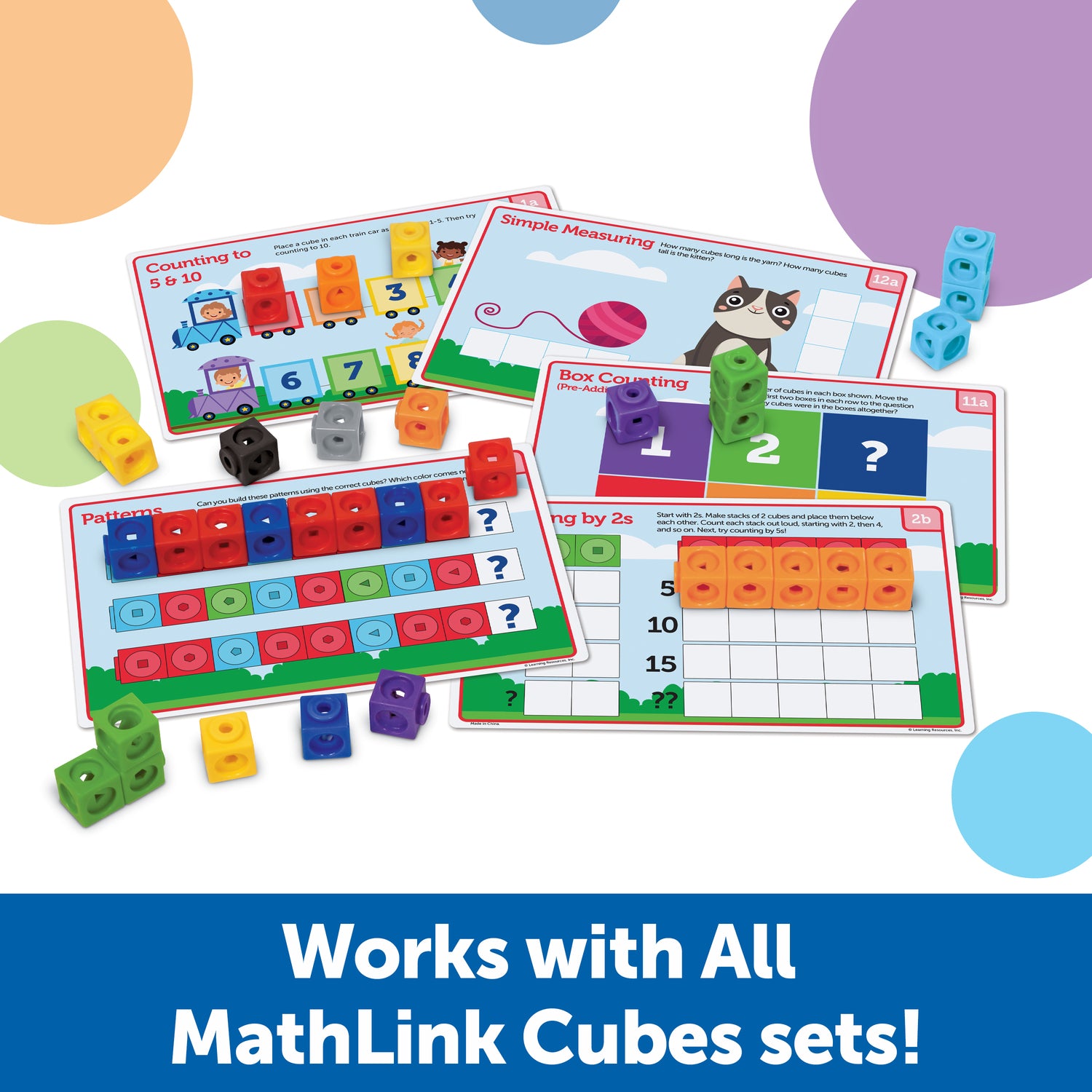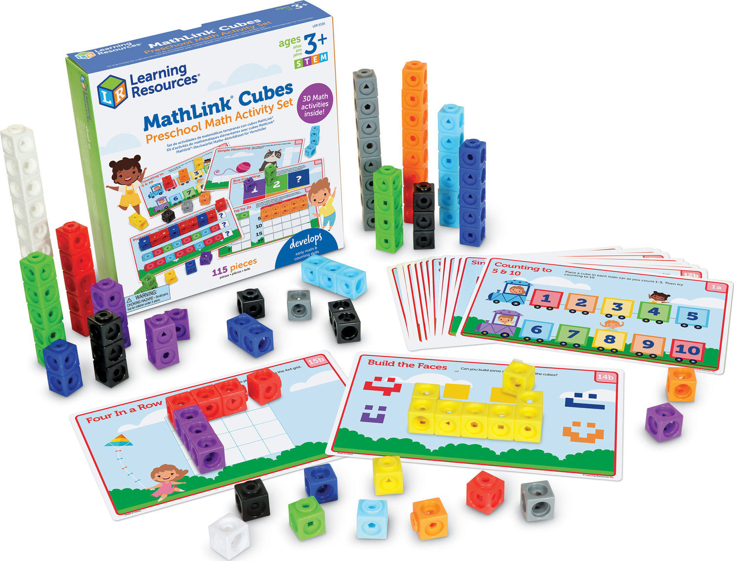 Regular price $29.99Little ones learn counting, sorting, matching, and other preschool-ready math skills with the hands-on puzzles, games, and math manipulative challenges found within the MathLink Cubes Preschool Math Activity Set from Learning Resources. Designed especially for preschoolers, this educational toy pairs these popular hands-on math manipulatives with a fun set of challenges that grow with kids' skills. As they explore the 15 double-sided write-and-wipe cards, kids use their connecting cubes to learn preschool math fundamentals including measuring, patterning, counting by 1s and 2s, and more! In addition to the cards, the MathLink Cubes Preschool Math Activity Set also includes a guide with even more learning ideas and homeschooling activities! Plus, this math challenge set also supports open-ended hands-on play with the help of 100 included MathLink Cubes in 10 bright colors—use the linking cubes to build a car, a castle, a creature, and more! This MathLink Cubes Preschool Math Activity Set works with all MathLink Cubes sets, so kids can build even more skills!
