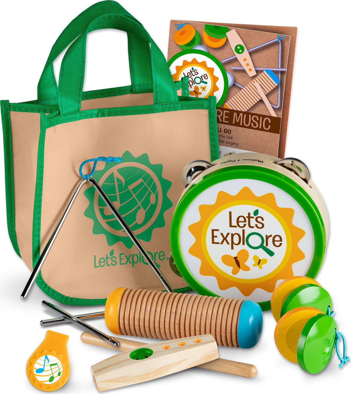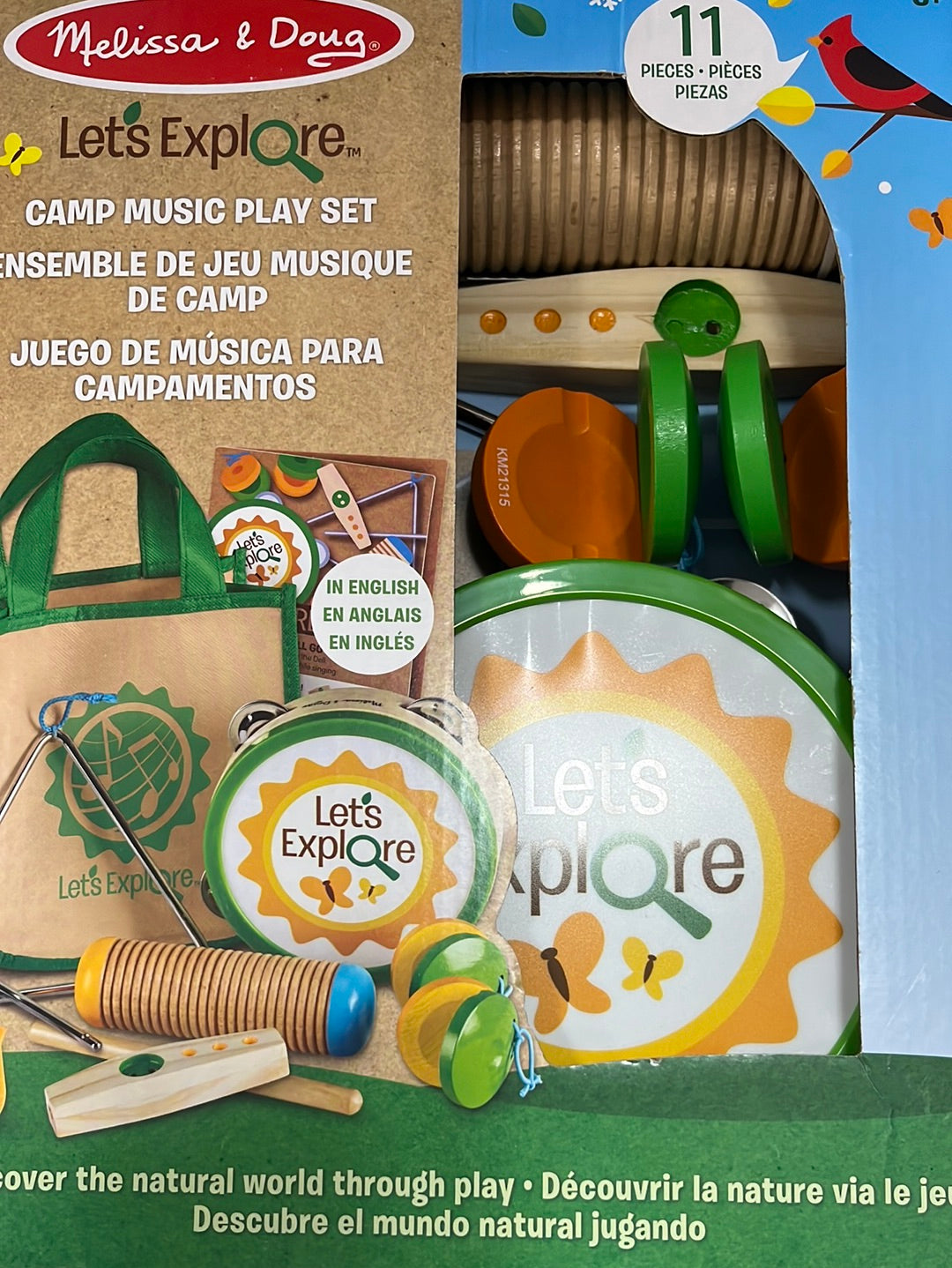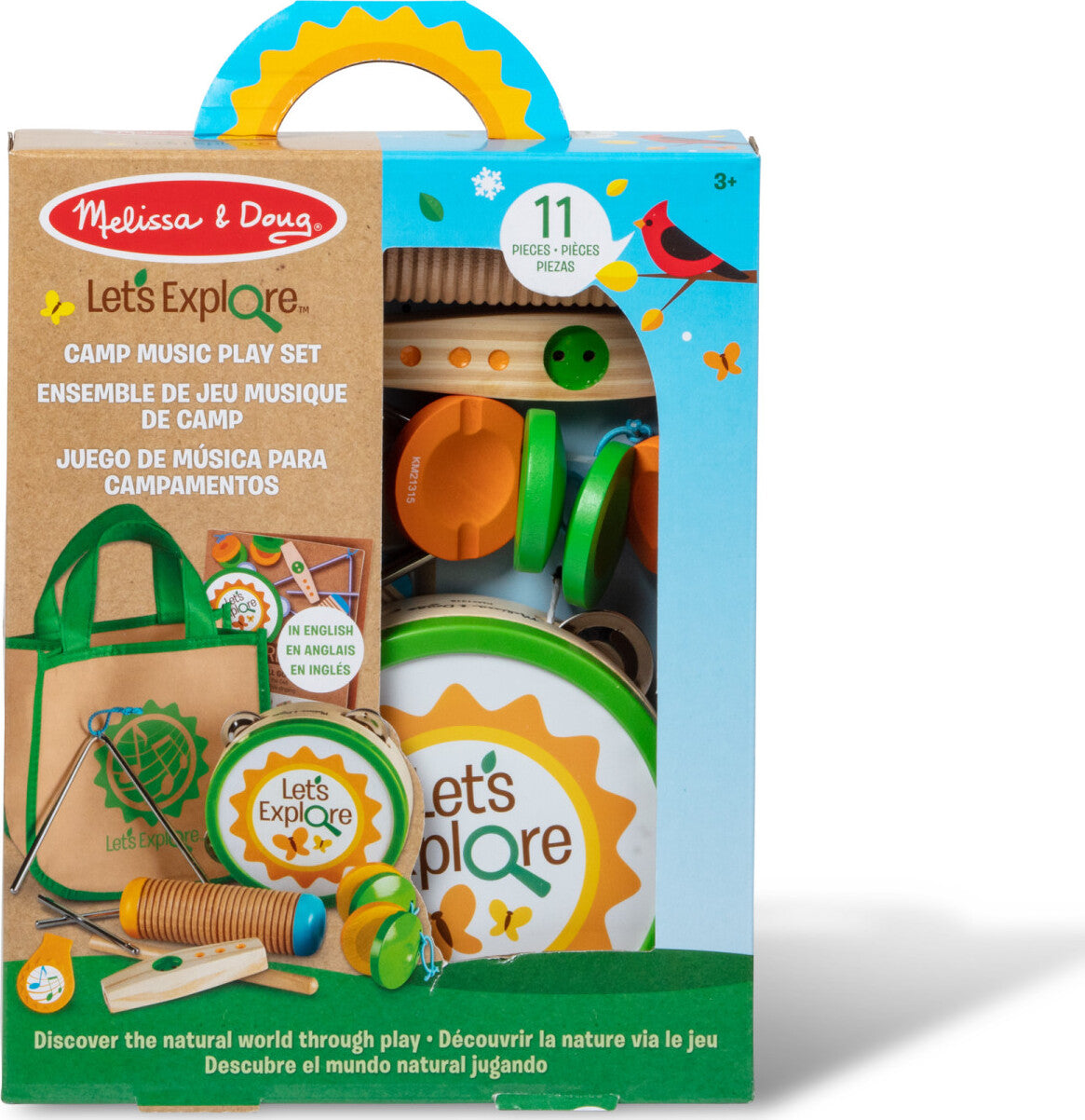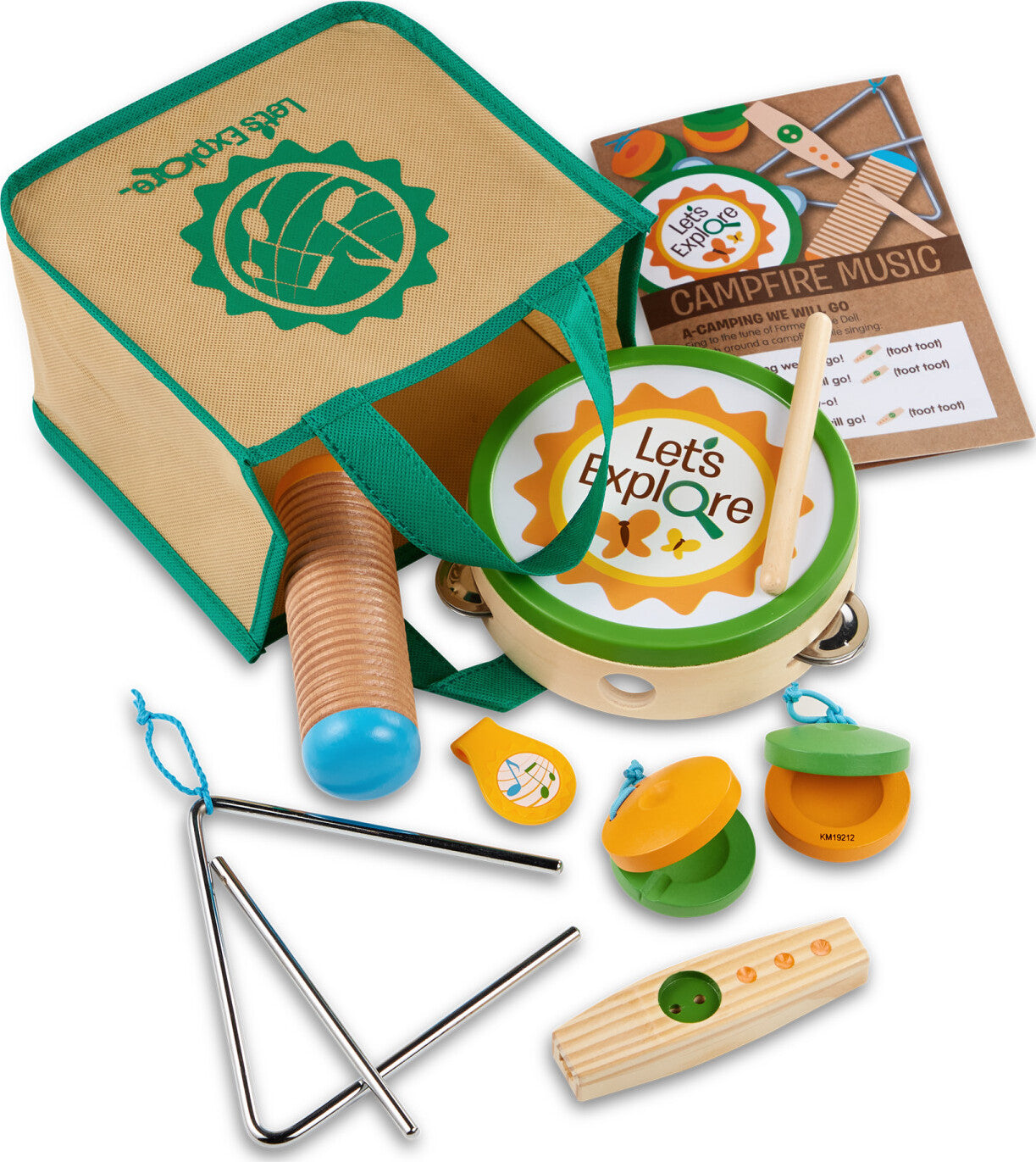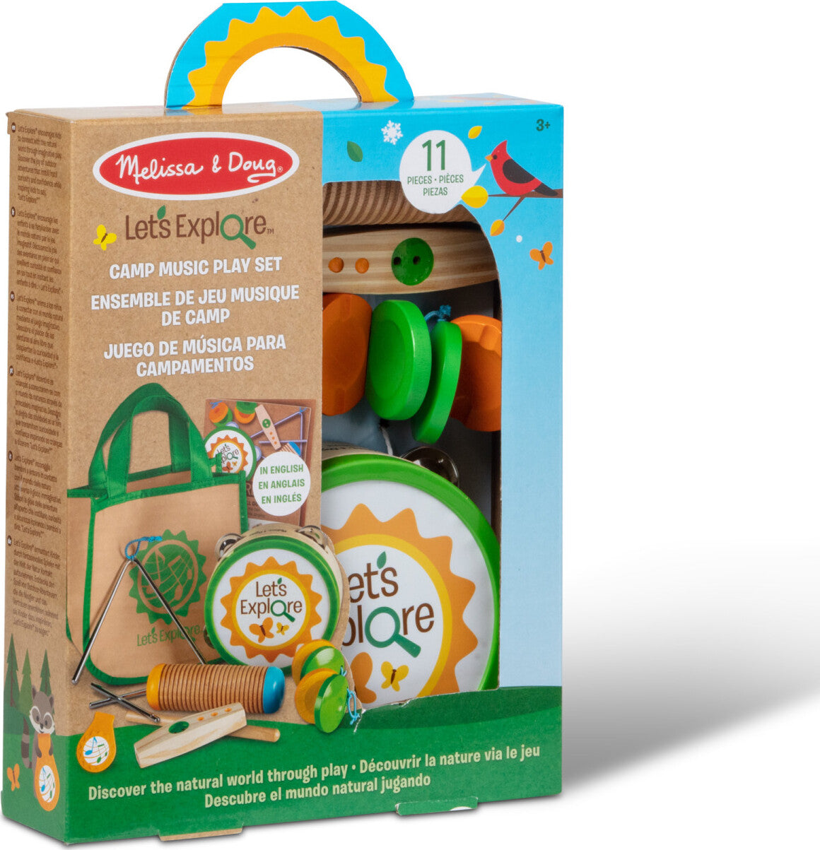 Explore the outdoor experience of making music around a real or pretend campfire with the 10-piece Melissa & Doug Camp Music Play Set! Shake, scrape, clack, hum, and ring these durable wooden and metal instruments, including a guiro and scraper, castanets, kazoo, triangle and mallet, and tambourine. Pack up the songbook and instruments in the handy tote to take the music-making fun on the road!