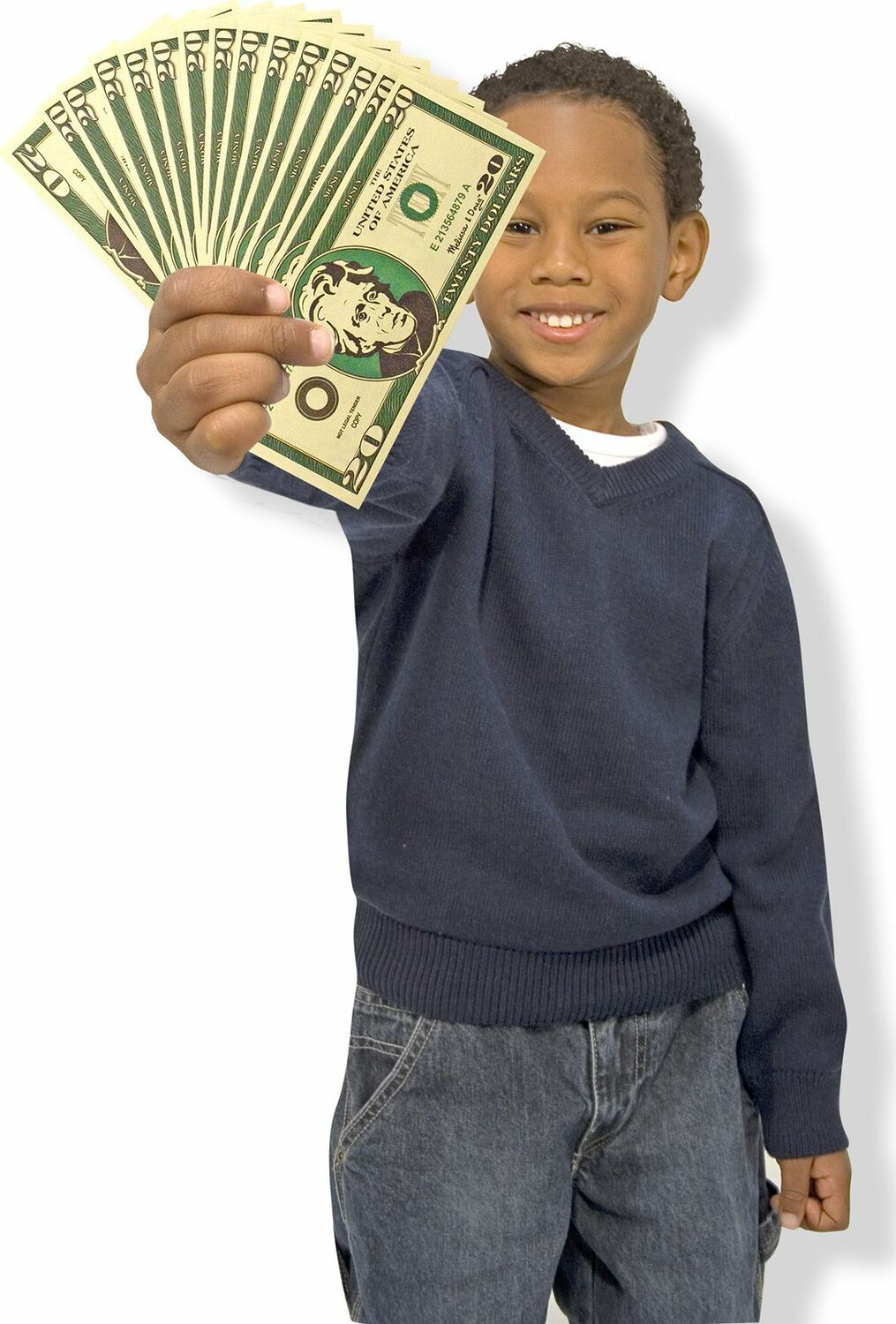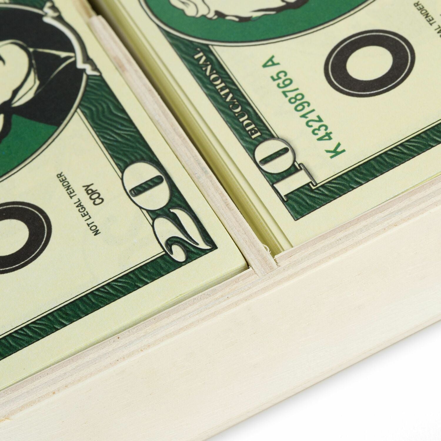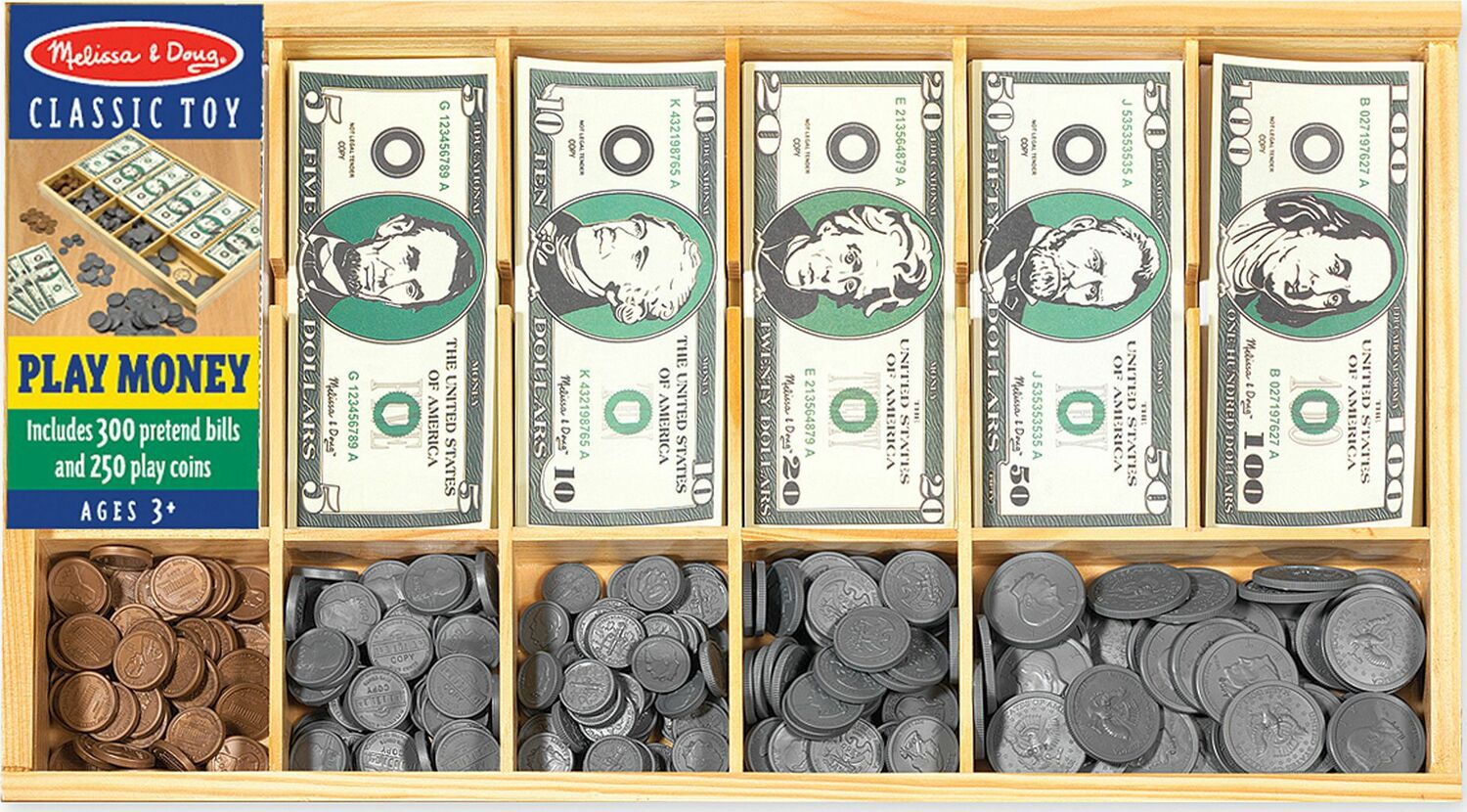 Never be short of (pretend) cash again! With fifty of each denomination, this set includes familiar looking paper bills and plastic coins. This stash of cash conveniently stores in a handy wooden "cash drawer" box. Each compartment has the denomination printed inside for easy matching cleanup.